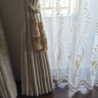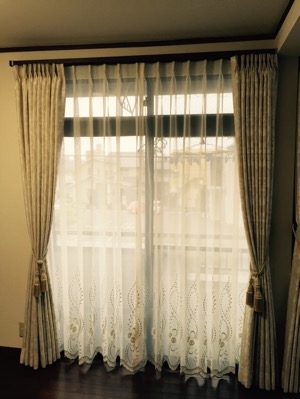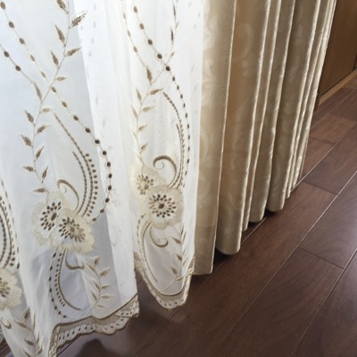 金の刺繍のレースカーテンにオフホワイトのドレープカーテンを合わせました。
