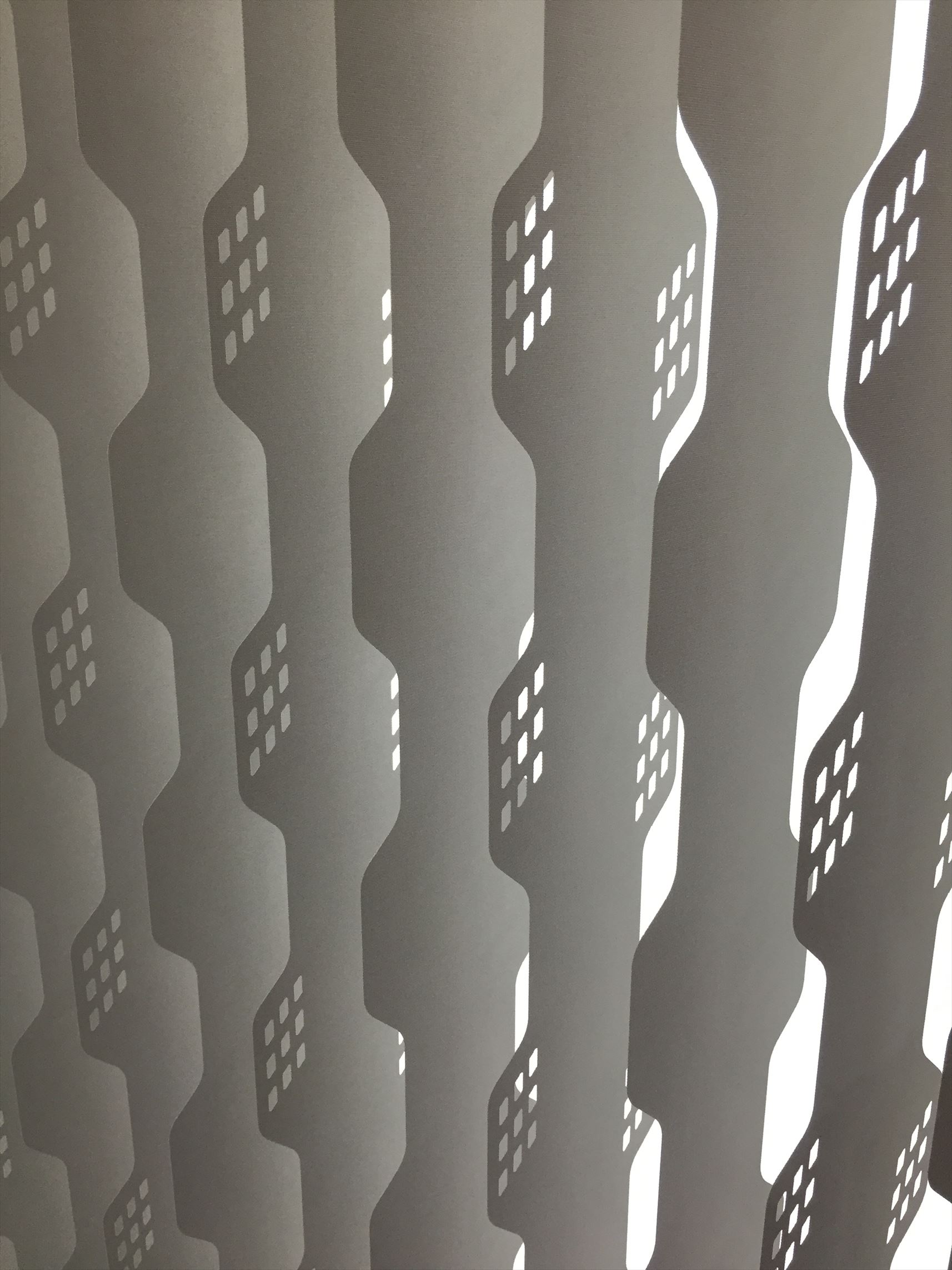 バーチカルのスラットはまっすぐでなく波型などの「デュアルシェイプ」タイプで、これにレーザーカットを施したものです。
