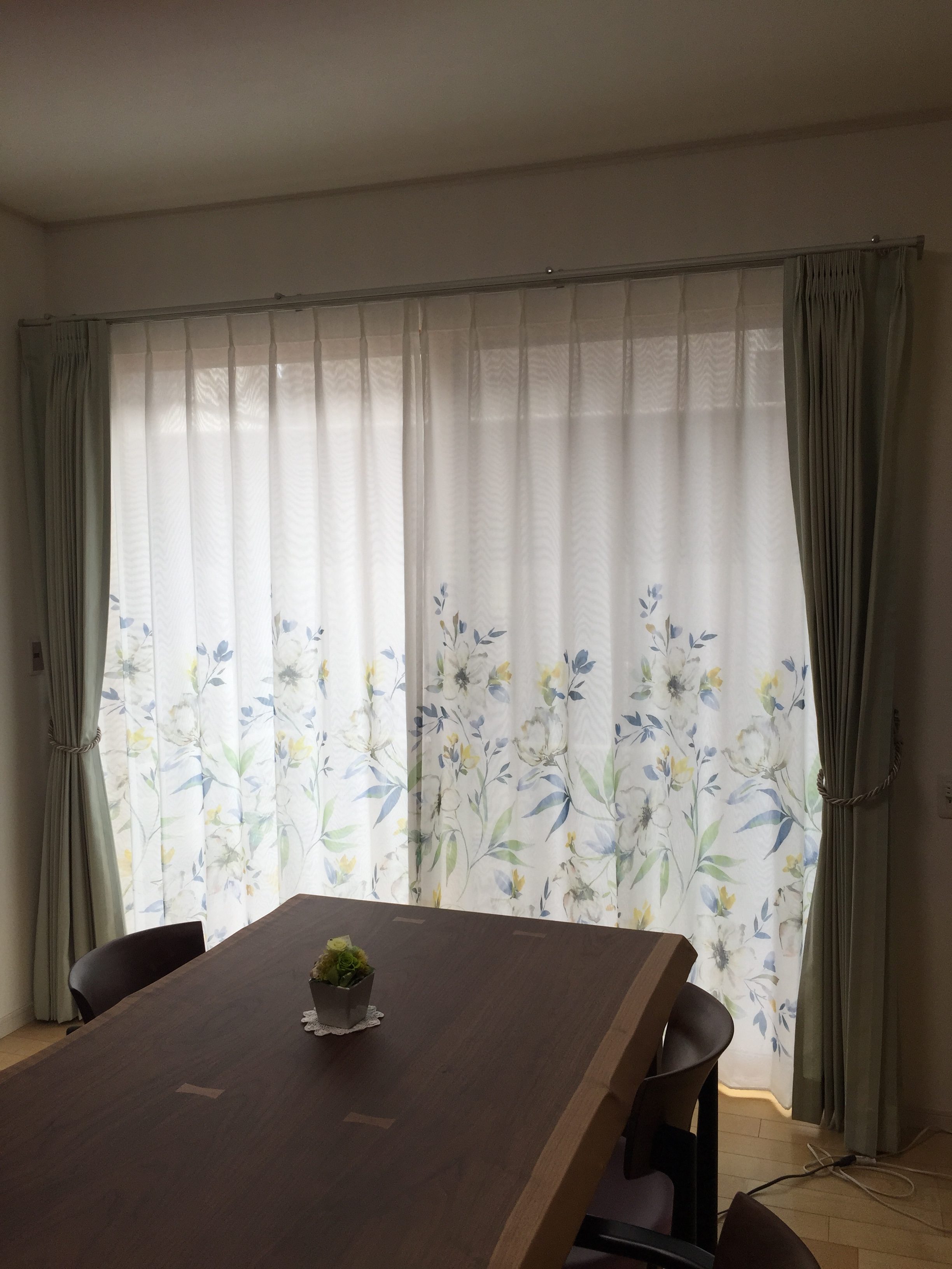 こんにちは、あにんつです。 カーテンの掛け替えのご依頼です。レースカーテンは、印象のある柄がご希望で この柄を気に入られました。 あまり透けない方が良い、とのことで裏に無地のレースを当て二重に縫製しています。 二重にすることにより柄も良く見えるようになり、モアレのようにもなっています。 ドレープは薄いグリーン色で、シンプルなロープタッセルを合わせました。 インパクトのある柄ですが、シンプルエレガントで上品な感じです