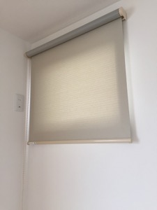 こんにちは、あにんつです。 高窓のロールスクリーンです。西側の窓で西陽を遮る為に遮光の生地を選ばれました😀 色は、優しいベージュです。 タチカワ RS-5821 巻き上がりが簡単なワンタッチ式 北欧風のライトともコーデネート、バッチリです