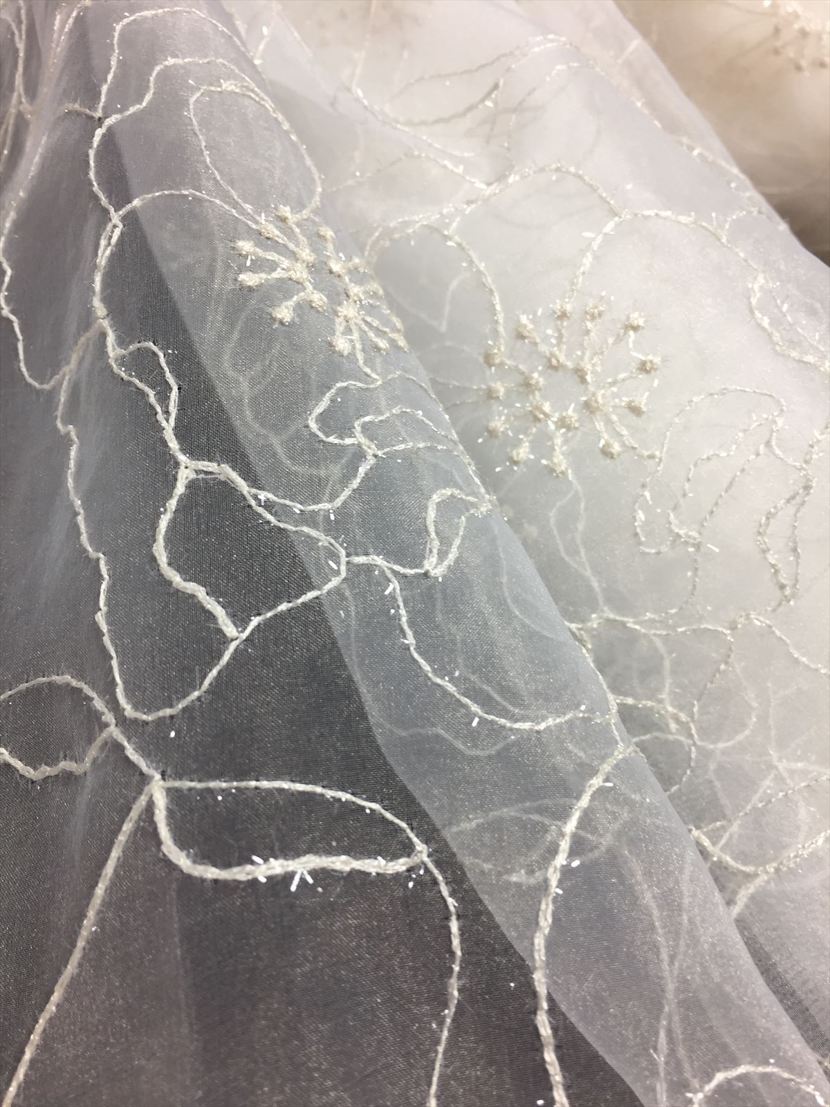 上品なオーガンジーに刺繍が施され、その刺繍部分にはキラキラした繊維が
