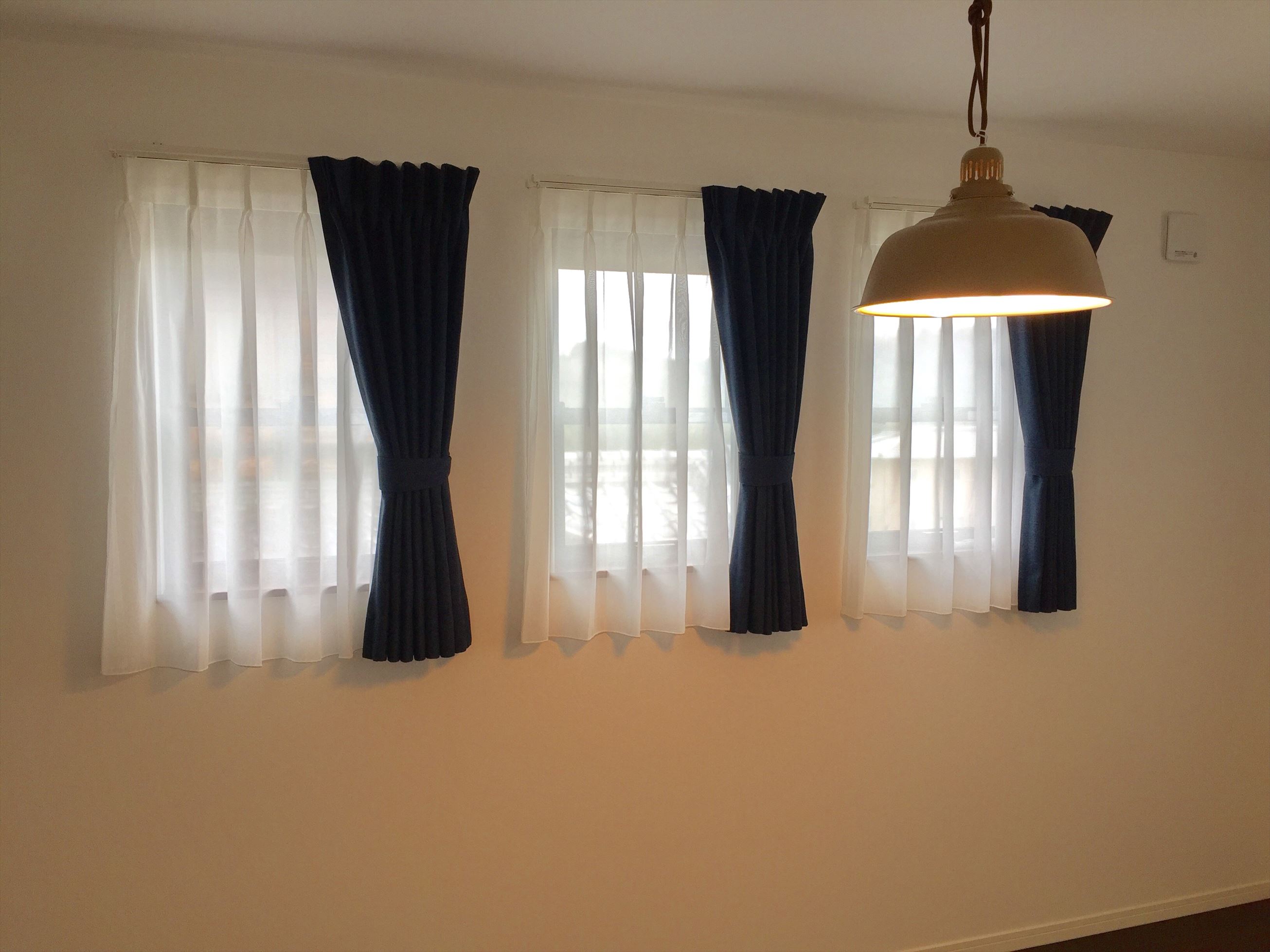 カーテンも同じく紺の遮光カーテンです。