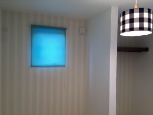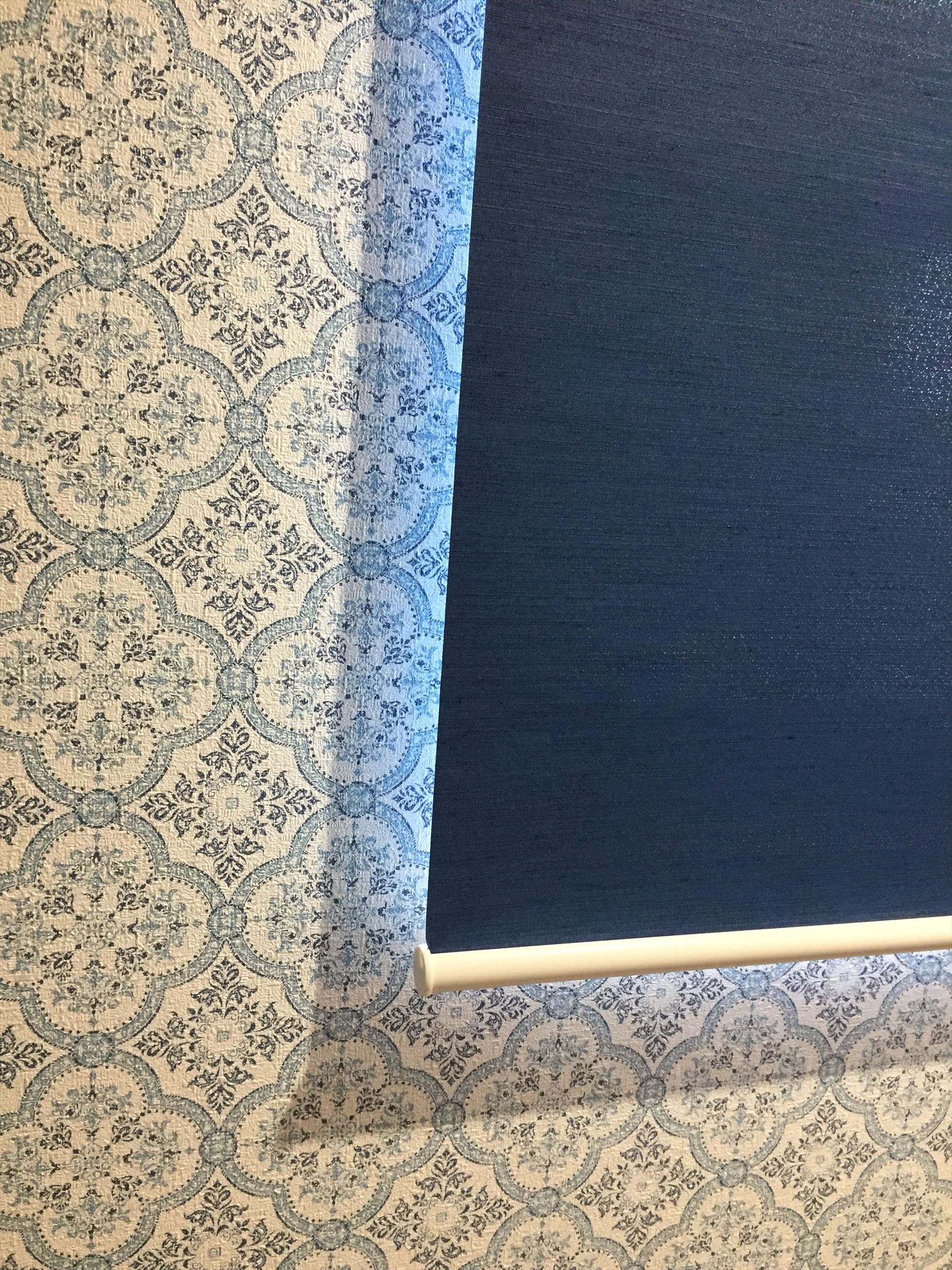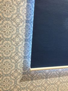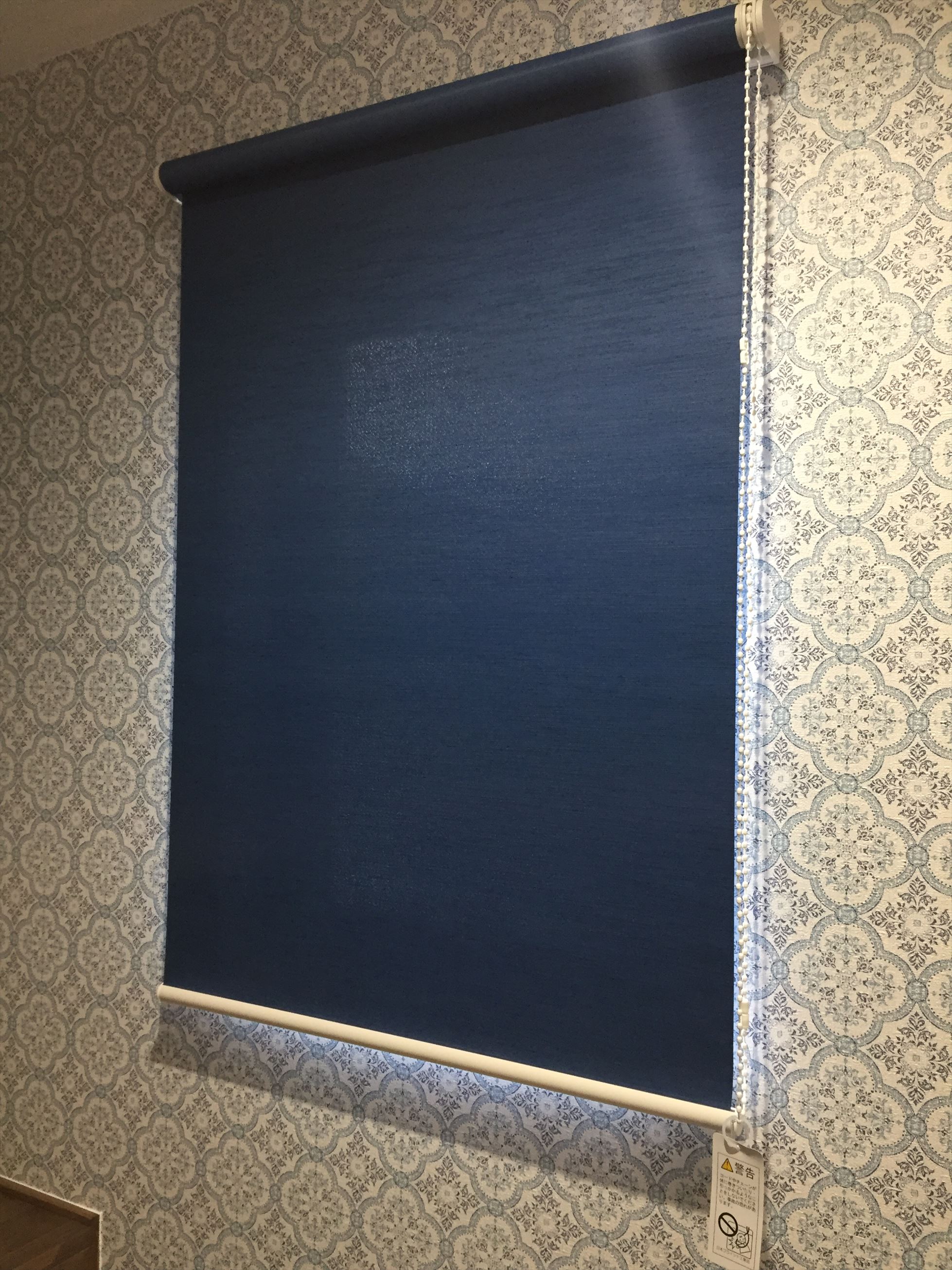 寝室の遮光ロールスクリーンはアクセント壁紙に合わせて紺を。