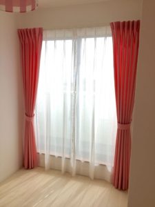 小学生のお嬢さんのお部屋はピンクの無地のドレープに、ピンクのドットの