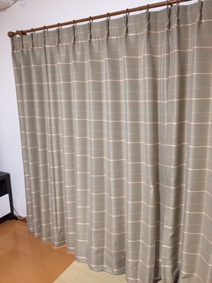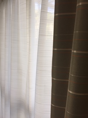 引っ越し先のリビングにレースとドレープのご注文を頂きました。お隣が近いということで遮光カーテンに見えにくいミラーレースです。ドレープはボーダー柄、それと同じような色味の細い線が入ったミラーレースでした。