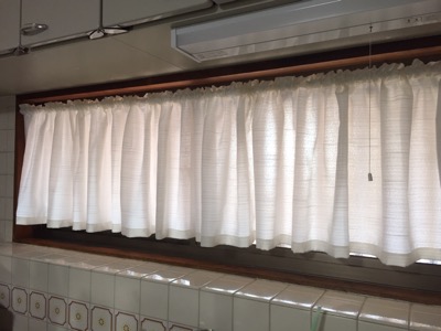 同じレースの生地を使ってキッチンと洗面所にカフェカーテンをつけました。