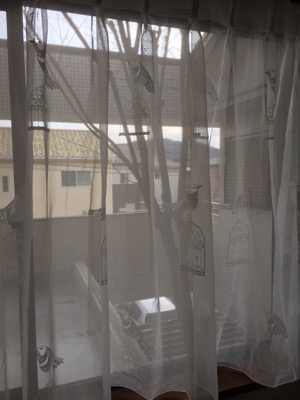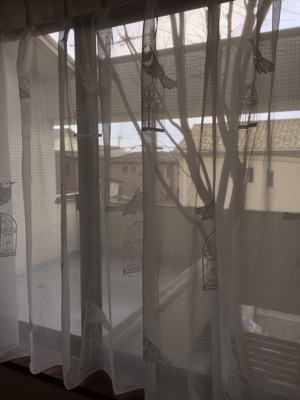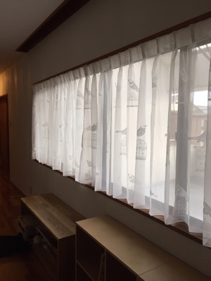 月うさぎです。 二階の廊下にある長い腰窓に可愛らしい鳥の刺繍が付いたレースを選んでいただきました。 邪魔にならないよう窓枠の中に収めました。 すると まるで木に鳥がとまっているようでしょ? 奥様が選ばれたのですが納品の日はお留守で、これを意図されていたのかどうか‥ どちらにしてもなんだかとても楽しい窓辺になりました。
