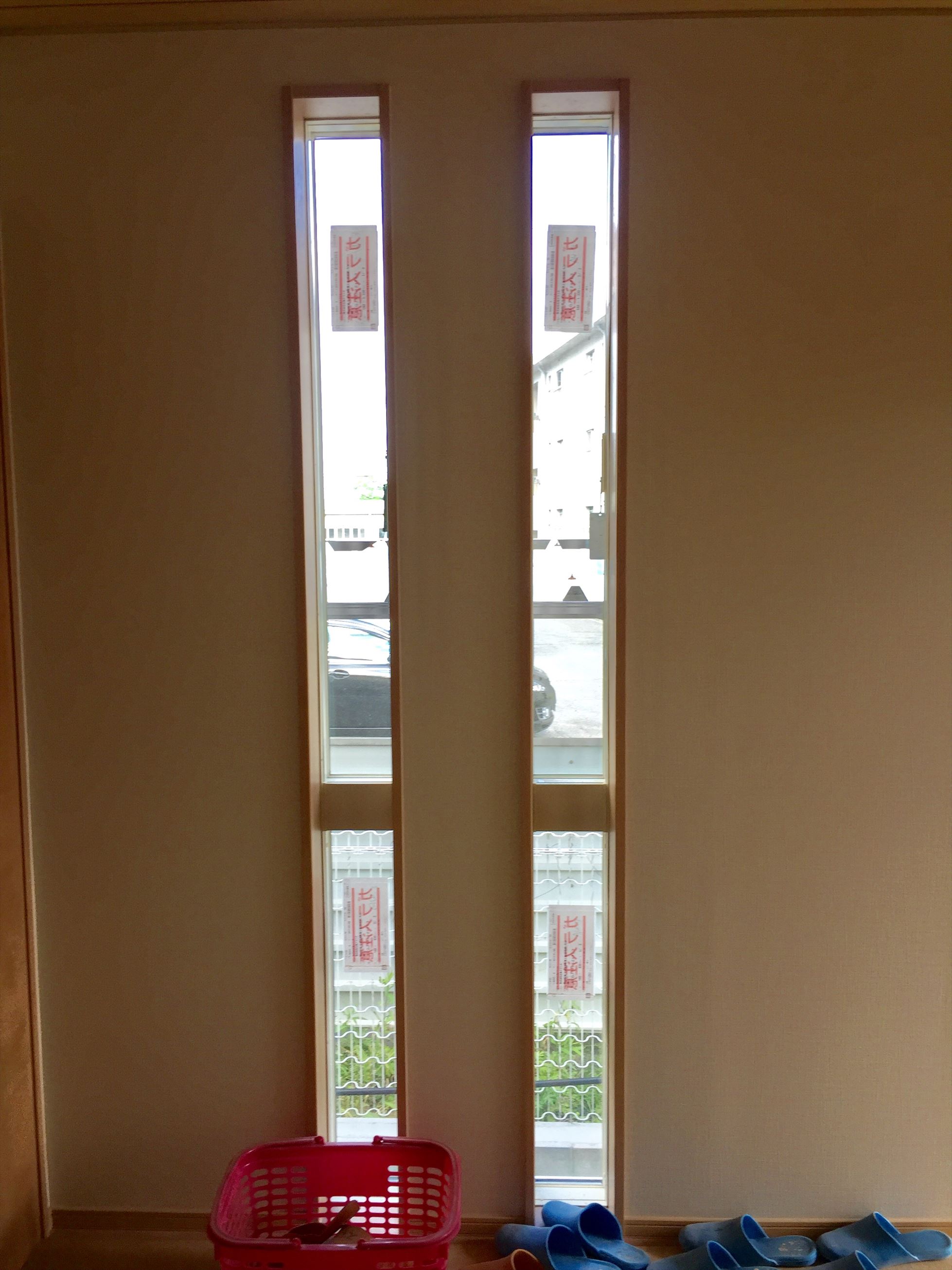 細長い窓ではありますが、向こうに駐車場も見えるので何かは付けたいところなので一安心![]()