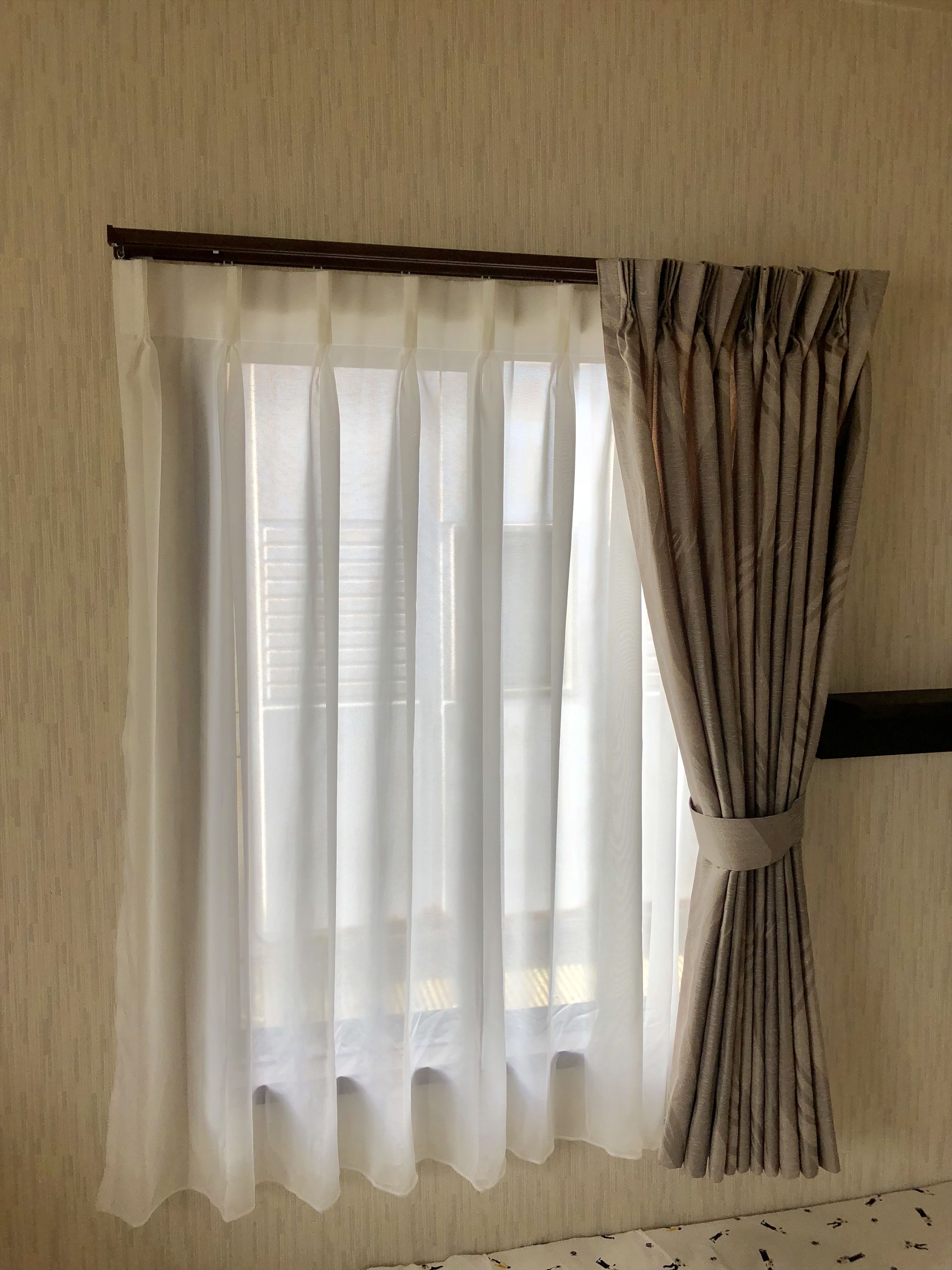 波模様がモダンなサンドベージュのドレープは以前のカーテンより軽く明るくなり、