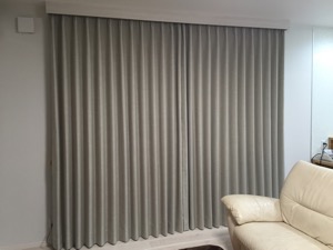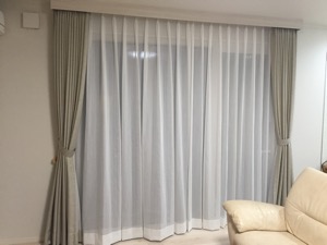 リビングのカーテンです。ファブリック感がある無地のカーテンです。天井からのカーテンですが、優しい色合いのなので圧迫感はなくお部屋の雰囲気を上品に演出しています✨