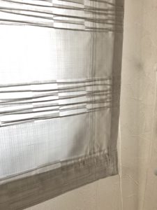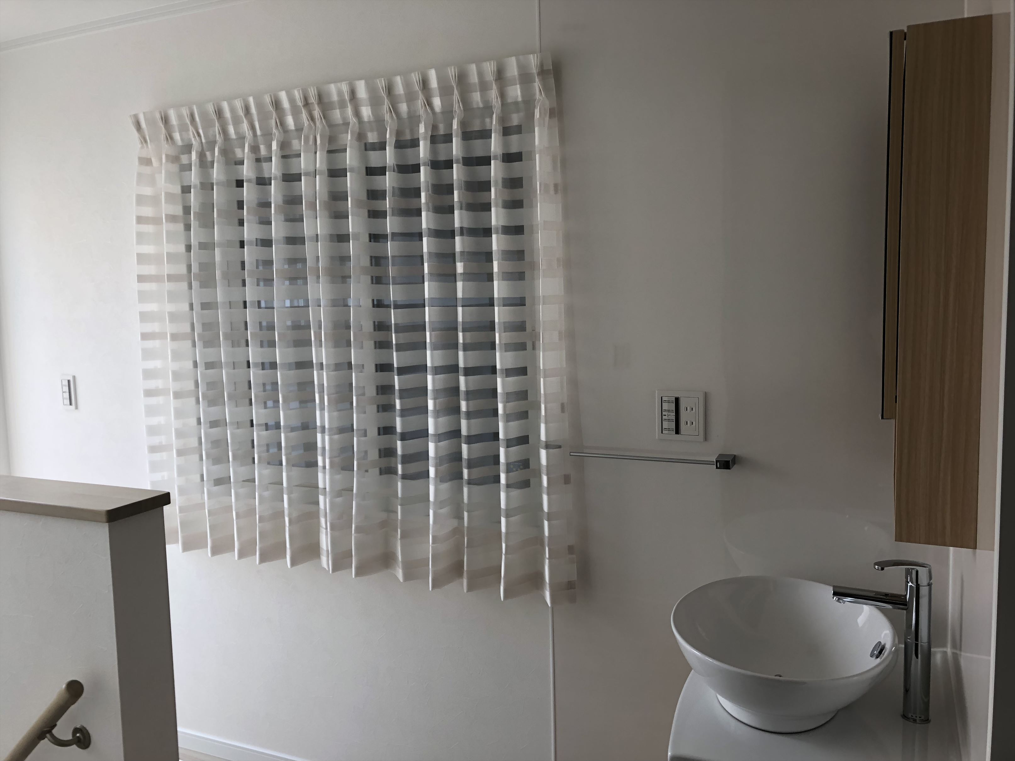 また階段ホールの腰窓はお隣の窓ととても近く、しかし厚手のカーテンを付けてしまうと暗くなってもったいないので、窓を開けた時にあまり見えないようボーダー柄のレースカーテンをお付けしました。ボーダーの一部はよく透けているのですが、模様のせいか向こうからは意外と見えないんですよ![]()