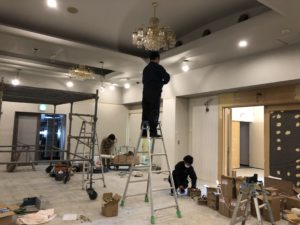 天井部分の塗装は足場を組んでの作業です。シャンデリア球もLEDに交換。