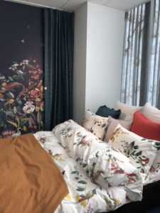 こちらはショールーム内のディスプレイ。よく見ると枕のところに鶴が![]()