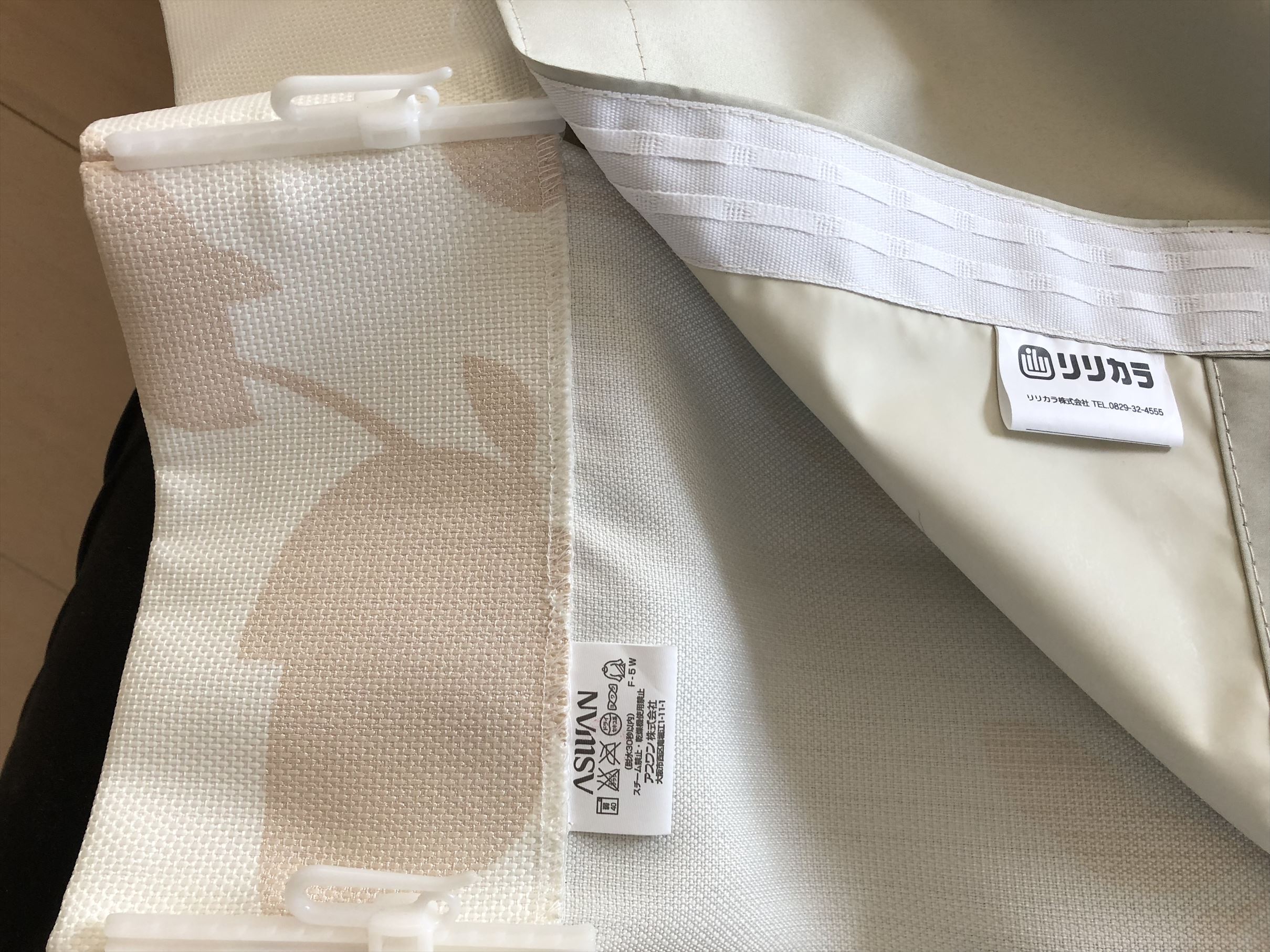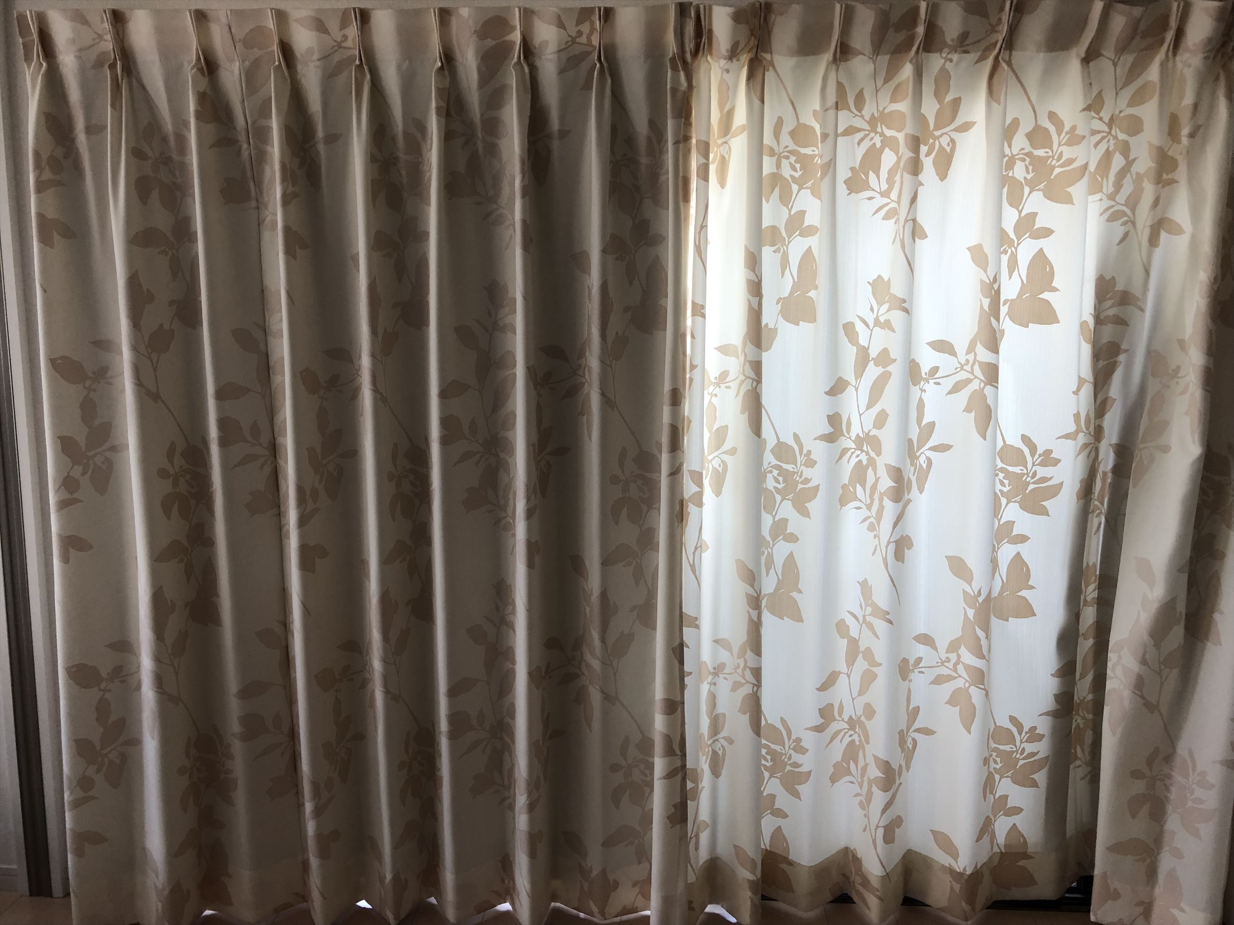早速遮光の裏地で手配しました!先にお使いのカーテンは色も淡く、裏側が黒い裏地だと透ける可能性があります(黒い下着が透けるような感じ)お選びしたのは白くバックコーティングされた完全遮光の裏地。これなら色が透ける心配はありません👍