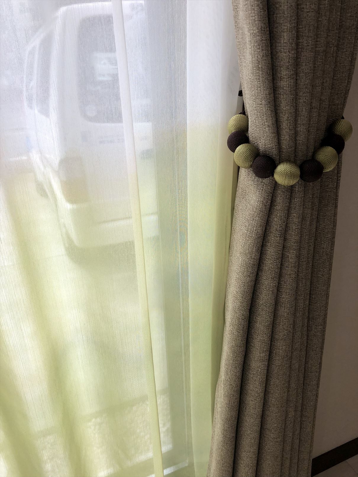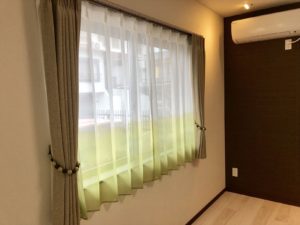 それがこちらです。レースカーテンはサンゲツの商品で、下からグラデーションになっています。カタログを見て奥様がとっても気に入られたとのこと😄厚い方のドレープカーテンは当初お選びだったものではなく、私がレースのテイストに合わせてお選びしたスミノエのざっくりとした遮光カーテンです。
