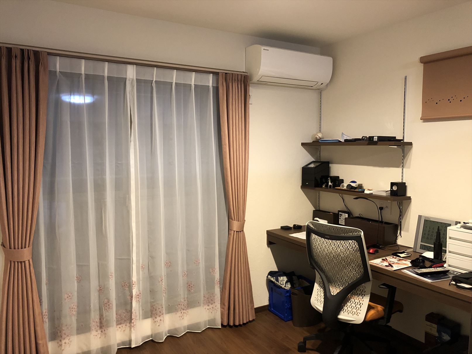 寝室にお選び頂いたドレープカーテンはスクリーンのお色とバッチリの