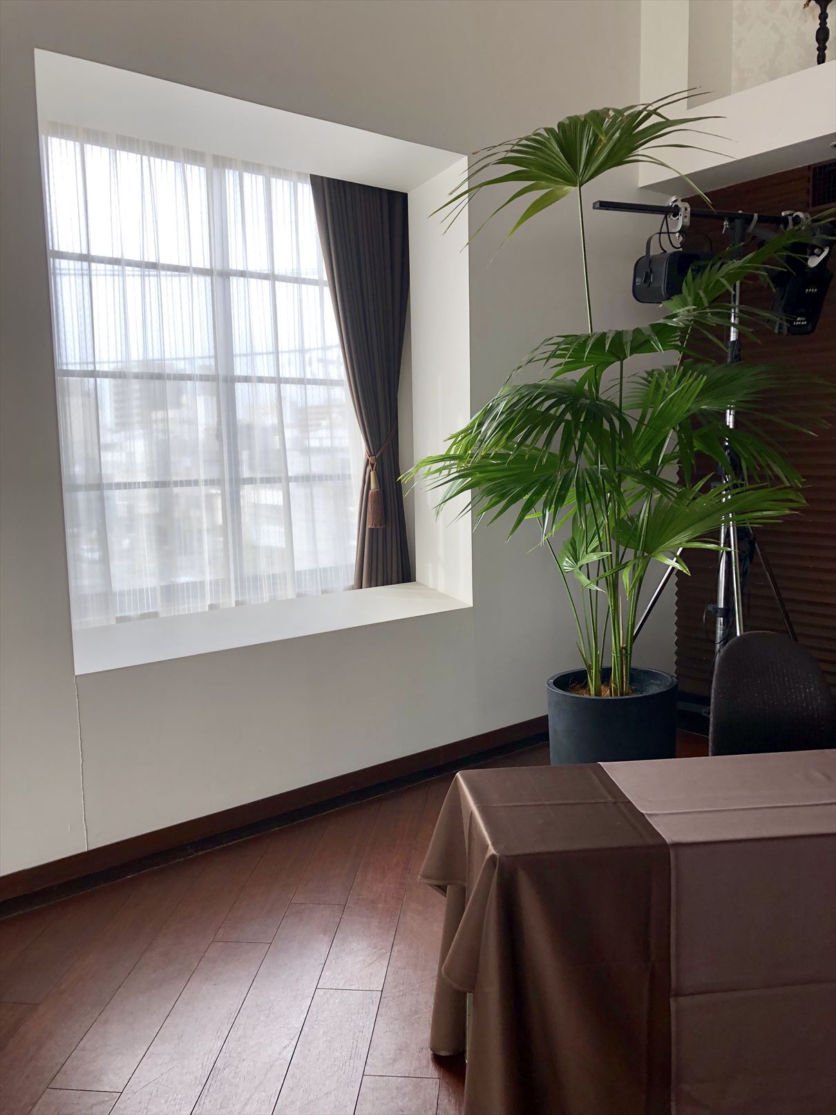 ドレープに関しては同じ遮光1級でも商品によってかなりの差がある為、私が事前に生地サンプルにライトを当て、より遮光性の高いものを事前にお選びしてお打ち合わせしました