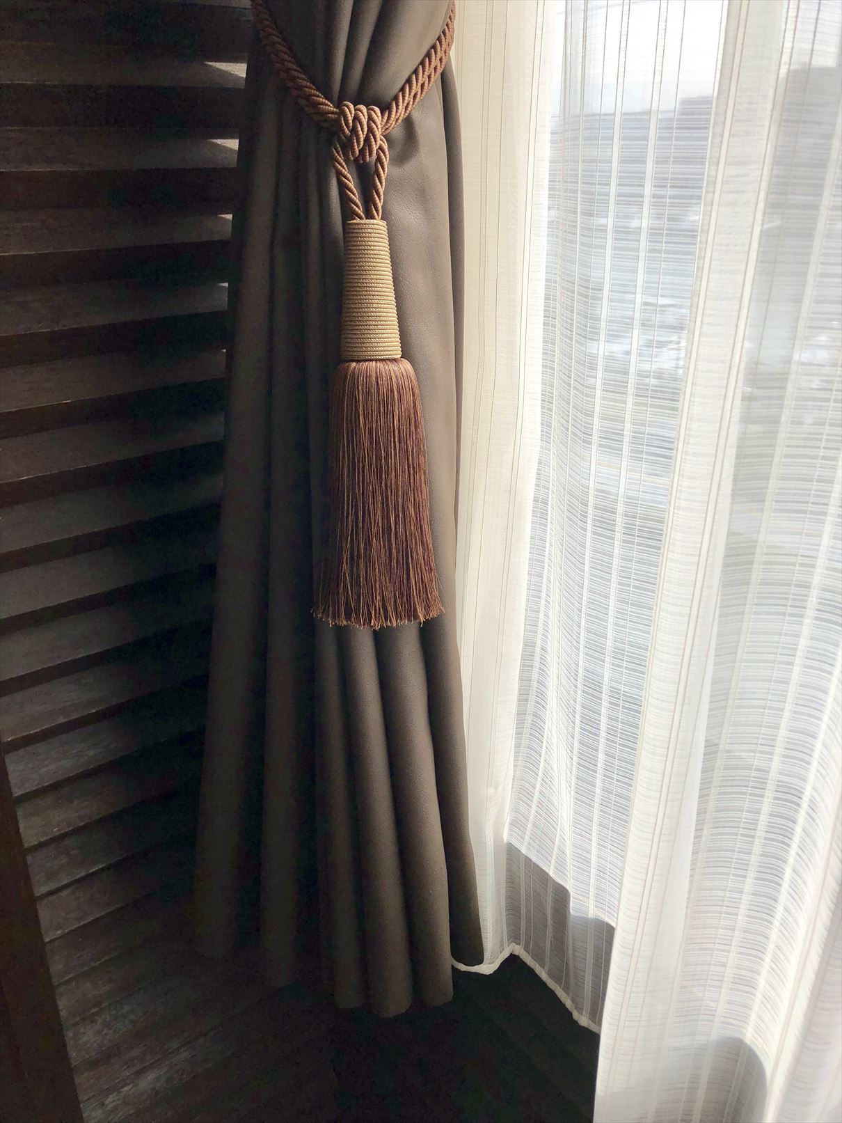 生地はもちろん防炎品でなくてはいけません。その中から見た目・機能性・価格などを総合してお選び頂きましたのが、スミノエの合皮風のドレープカーテンに、リリカラのストライプのレースです![]()