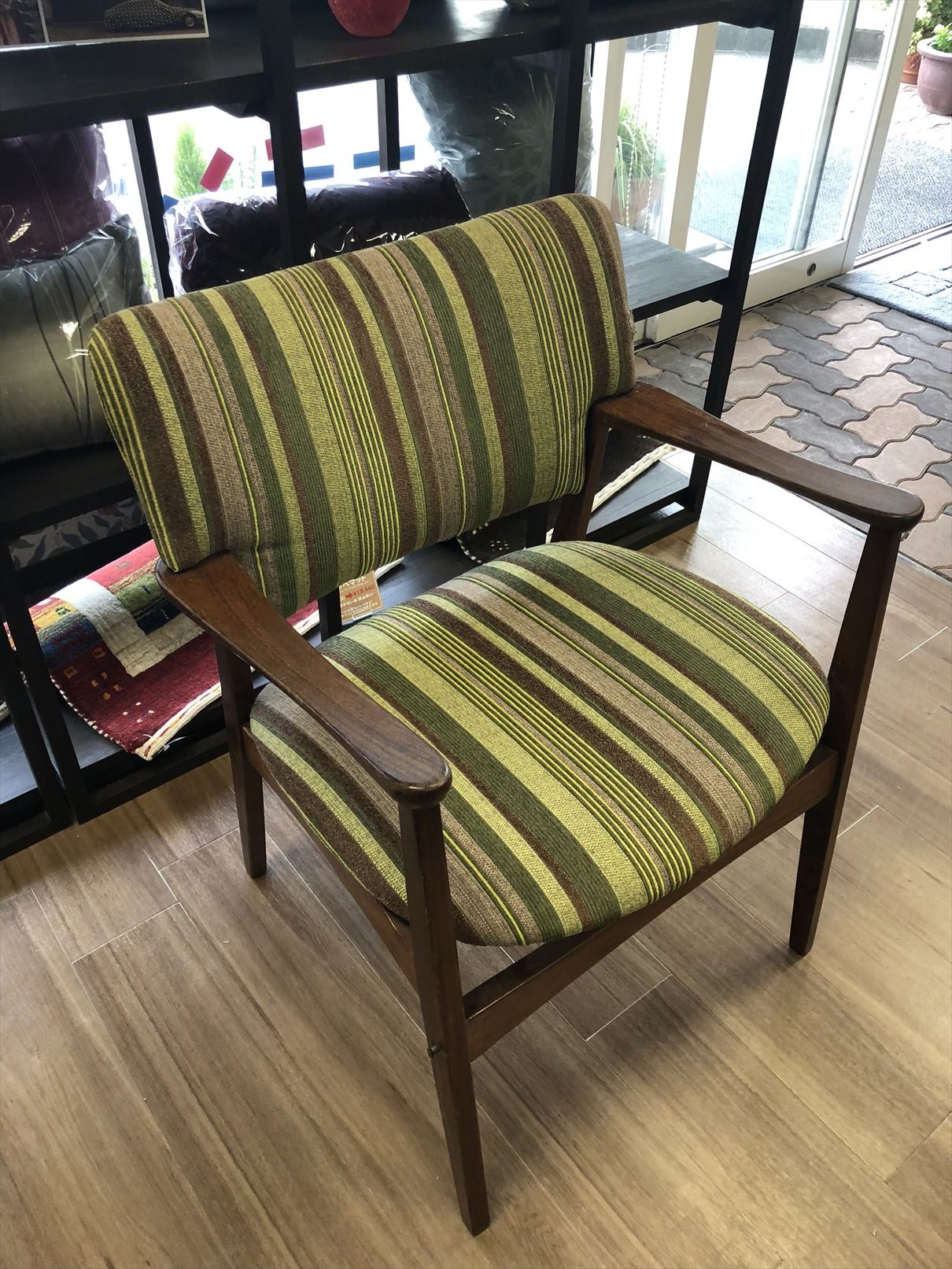古い椅子だとは聞いていたので肘掛けや脚の部分はニスの塗装が取れている部分があったのですが、そう言う部分がアンティークっぽくて生地に合うねと職人さんも言われておりました![]()