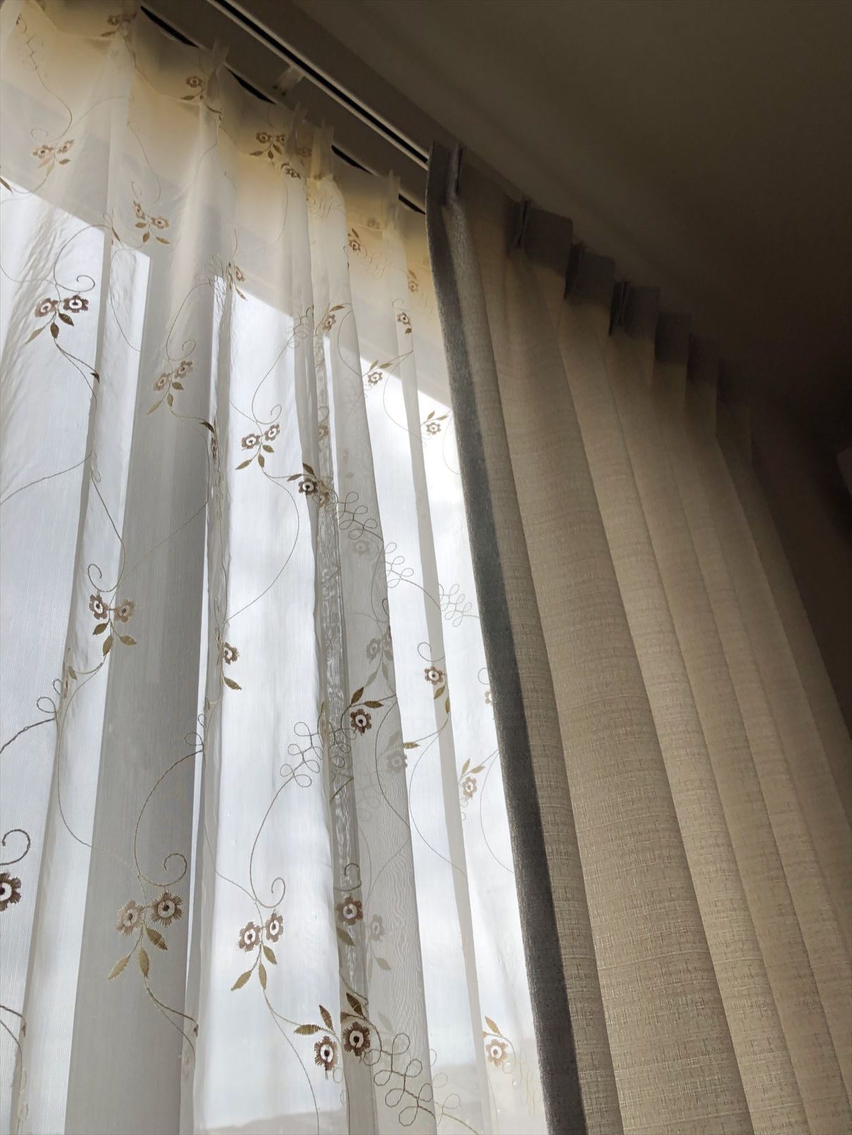写真を撮ると見えにくくなってしまいましたが、厚地のドレープカーテンはラメ感がある無地の生地です![]()