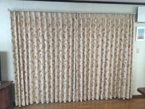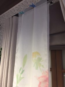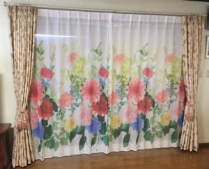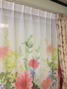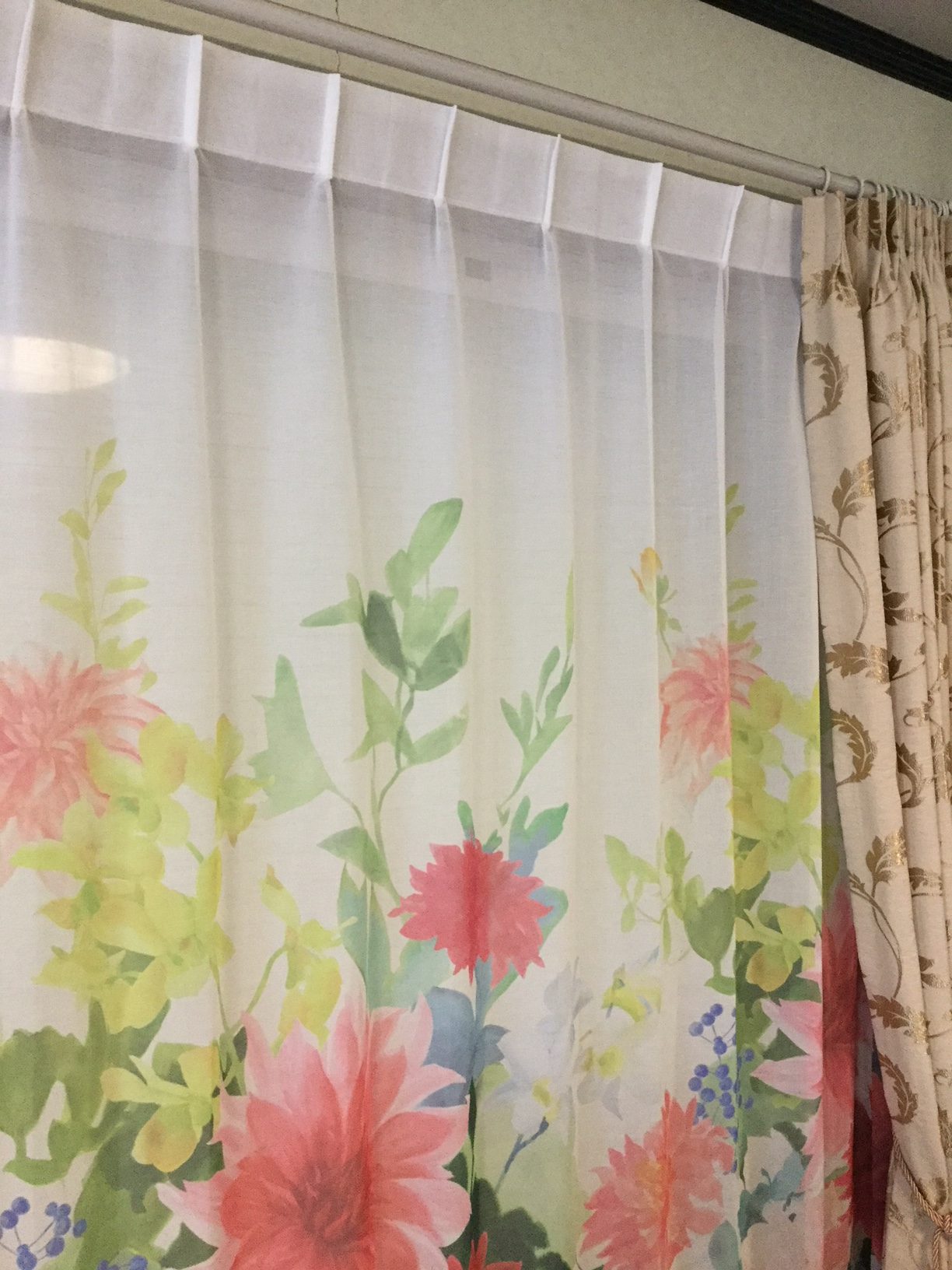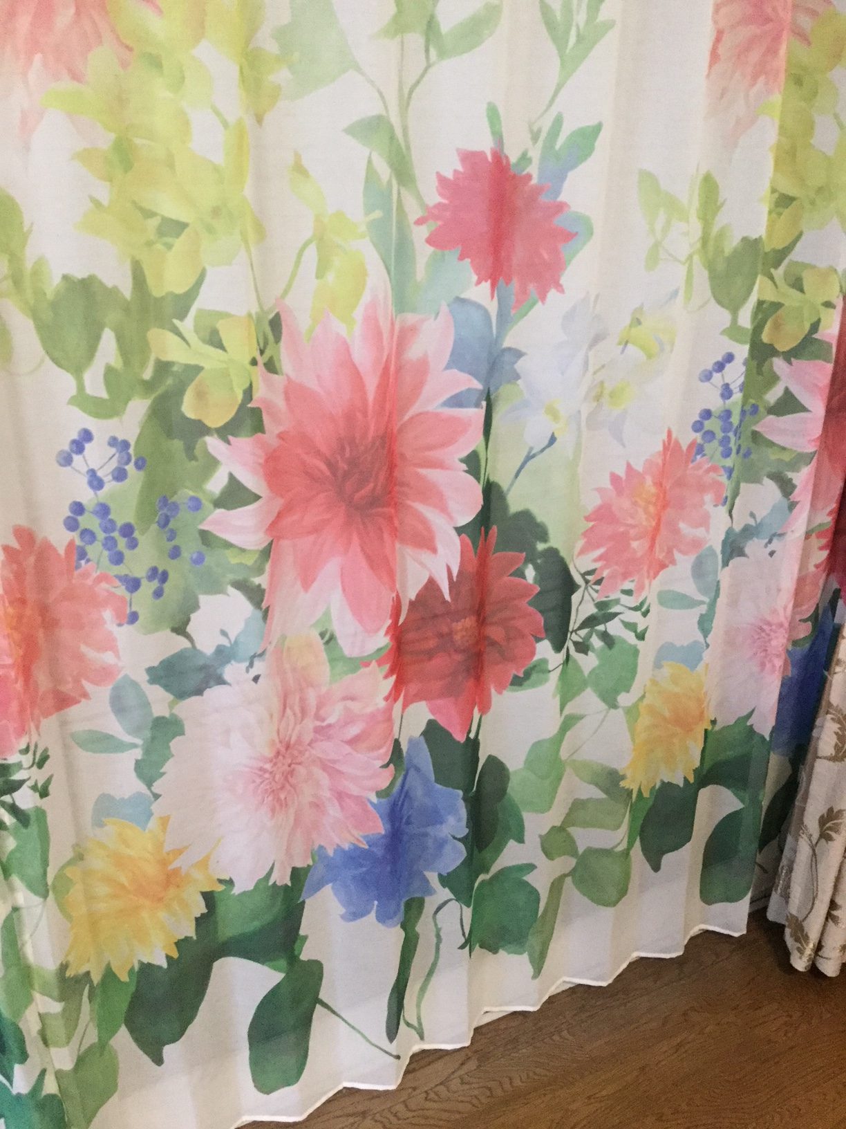 こんにちは、あにんつです。 大胆な花柄のレースカーテンです。部屋の中に花畑が広がりました 川島織物セルコン FF1191 山の高さや谷の幅をいろいろ試し、ドレープの出方を確認しました。 ドレープカーテンは、PASAYA RIVIERA GOLDです。エレガントで上品ですね