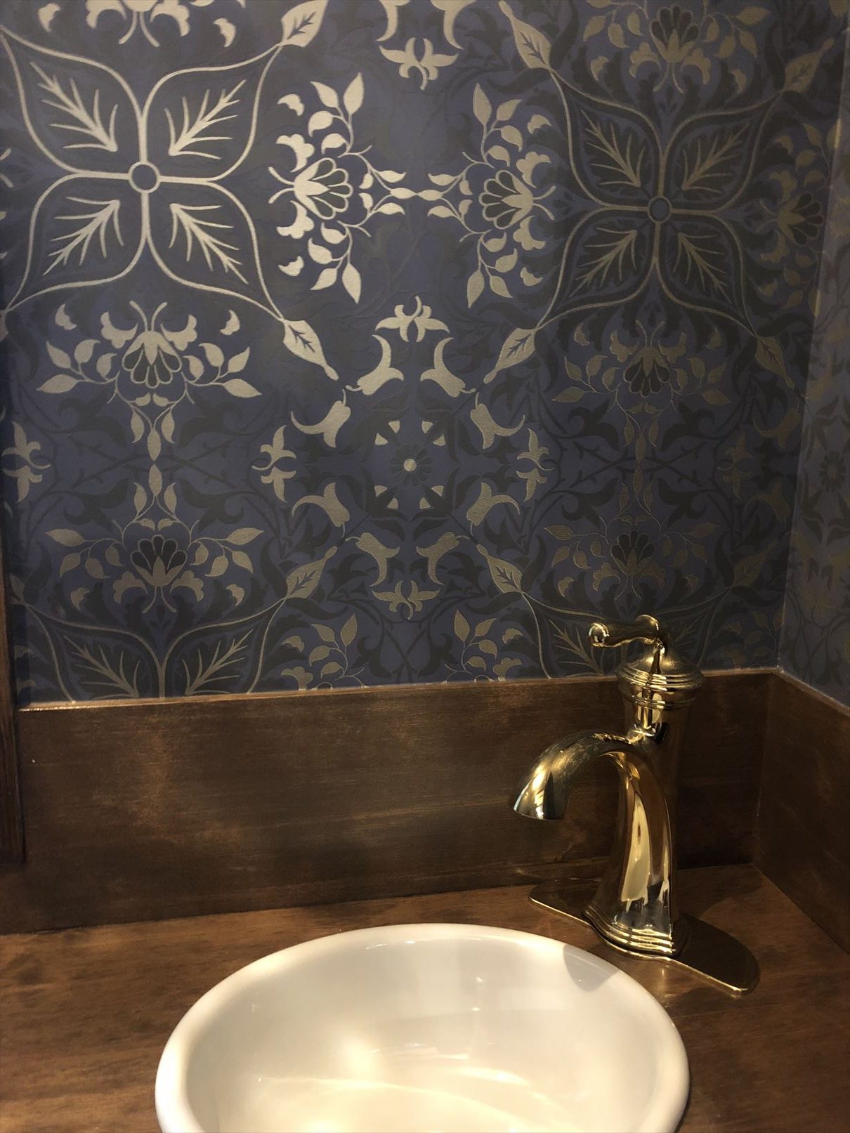 洗面所は こちらもウイリアムモリスですね。優しいブルーのマリーゴールドです。
