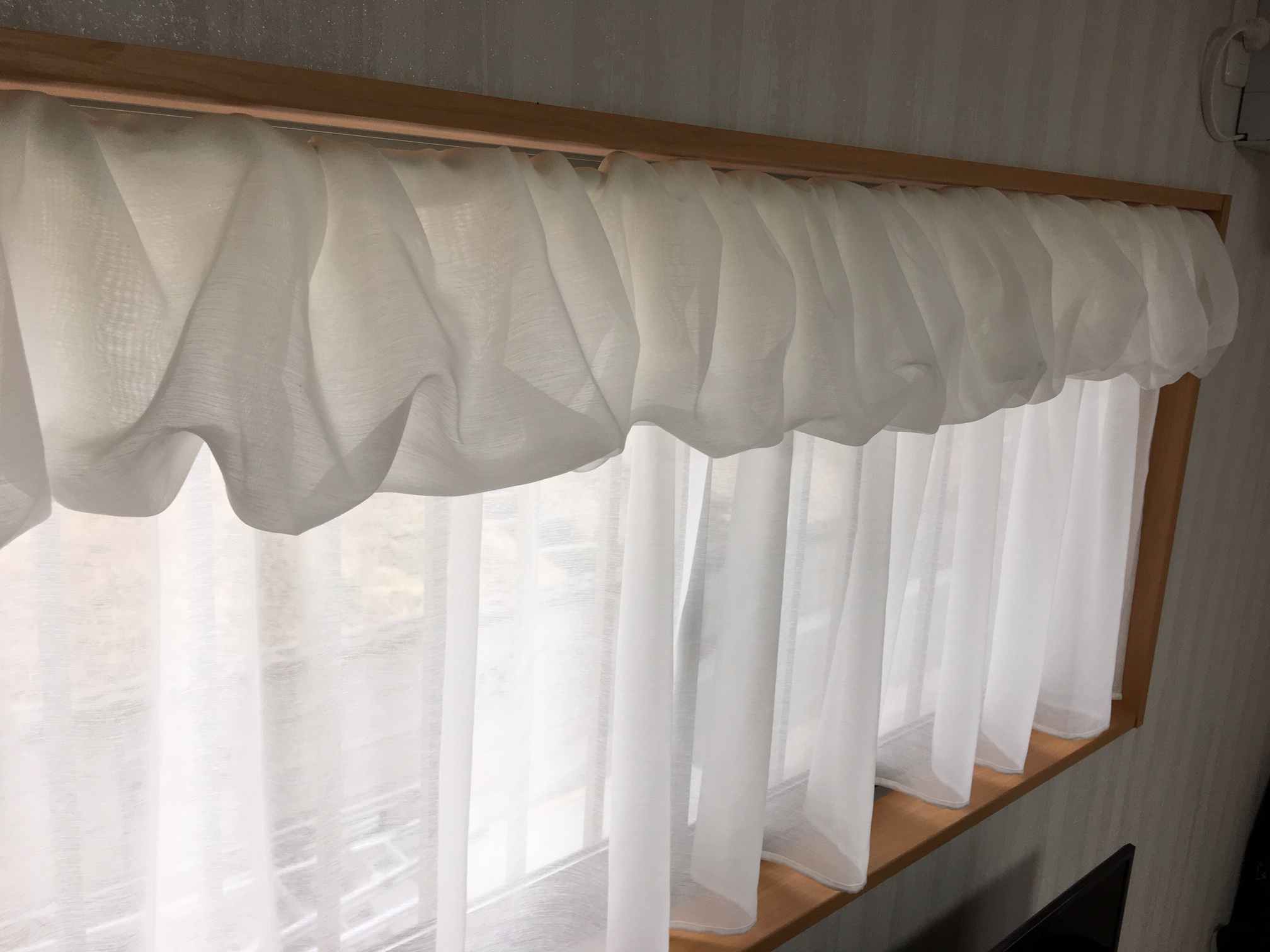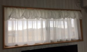 こんにちは、あにんつです。 横に長い窓のカフェカーテンです。レースだけの窓なので、デザインしたカフェカーテンをご提案させて頂きました。トップはバランス仕様です。 バランスの生地をクシュッとパフのようにスタイリングしています。可愛いですね生地を二重にしてるから出来るんですよ