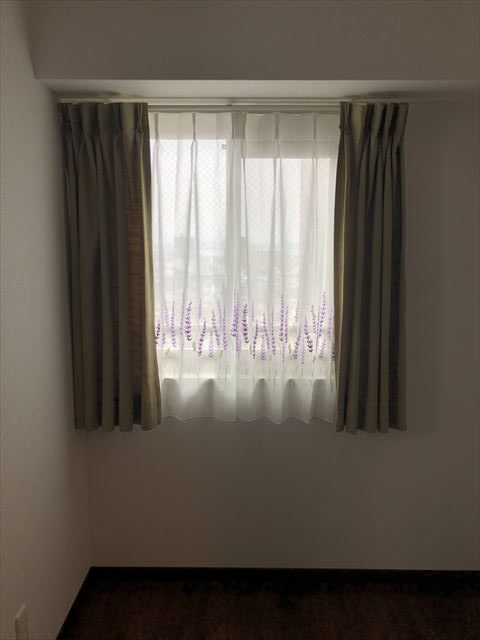 奥様のお部屋は紫のお花の刺繍のレースカーテンとグリーンの厚地のカーテンで優しい雰囲気です![]()