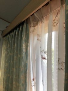カーテンはレースカーテンを悩まれておりましたが刺繍の可愛らしいレースカーテンと、鮮やかで落ち着いた花柄のグリーンのドレープカーテンのとっても素敵な組み合わせをお選び頂きました