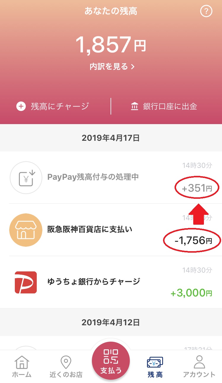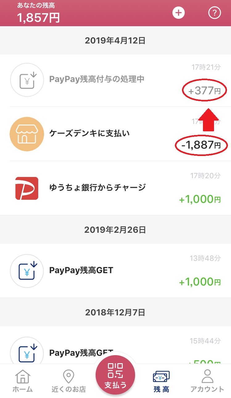 家電量販店では1,887円の買い物で377円がキャッシュバック、パン屋さんでは1,756円で351円のキャッシュバックです![]()