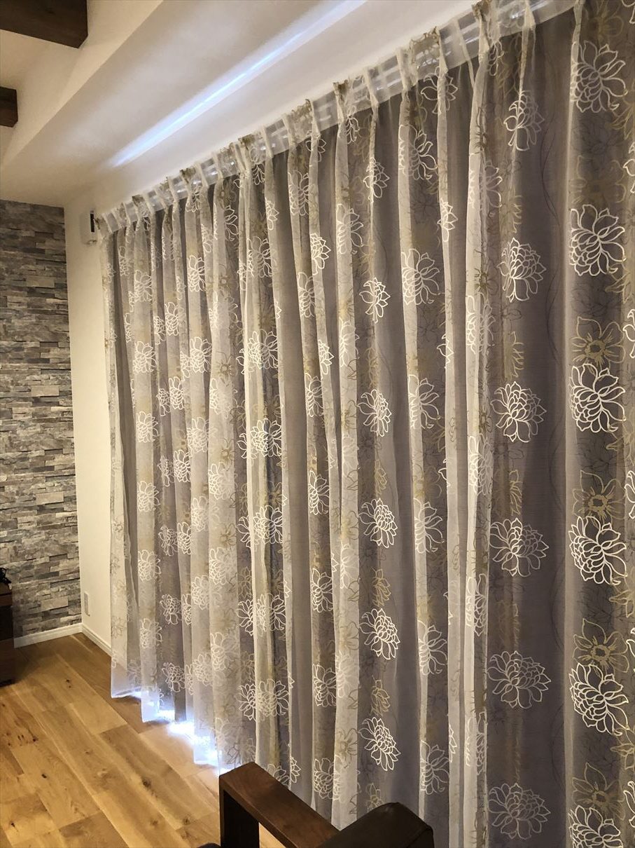 こちらのお客様はご相談に来て頂いた時から「リビングはモダンな雰囲気に」とお考えでした。通常のカーテンでモダンな柄を探していたのですが、お話を聞いていると道に面した窓では無いので人の目線はあまり気にならず、レースの生地が薄めのものでも構わないとの事でしたので少し雰囲気が変わるフロントレーススタイルをご提案させて頂きました。