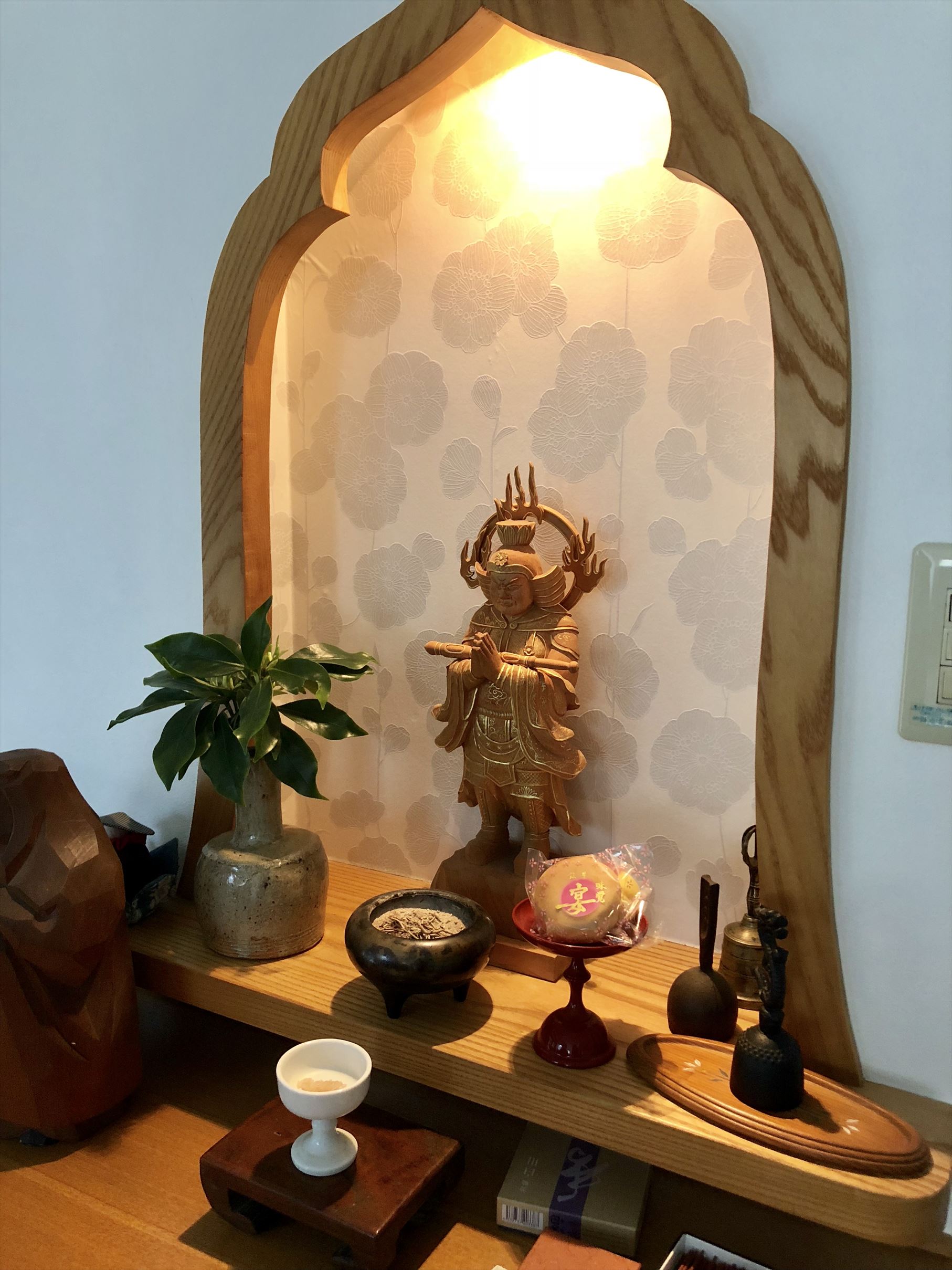 玄関におられた韋駄天様も戻ってこられました。以前はこの中はじゅらく風の壁紙で和風テイストだったのですが、ご主人(ご住職)のご希望でとってもモダンテイストな空間に生まれ変わりましたよ![]()