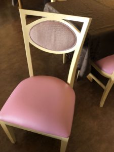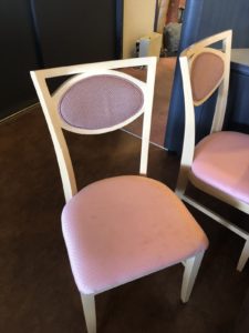 シミが目立ってきたので、今回張替えをご依頼されました!もちろん今度は汚れても拭き取れる合皮タイプ背もたれの方はこのまま残すので(この張り方が意外と大変なのでそのままで)一番近いピンクで座面のみ張り替えました!