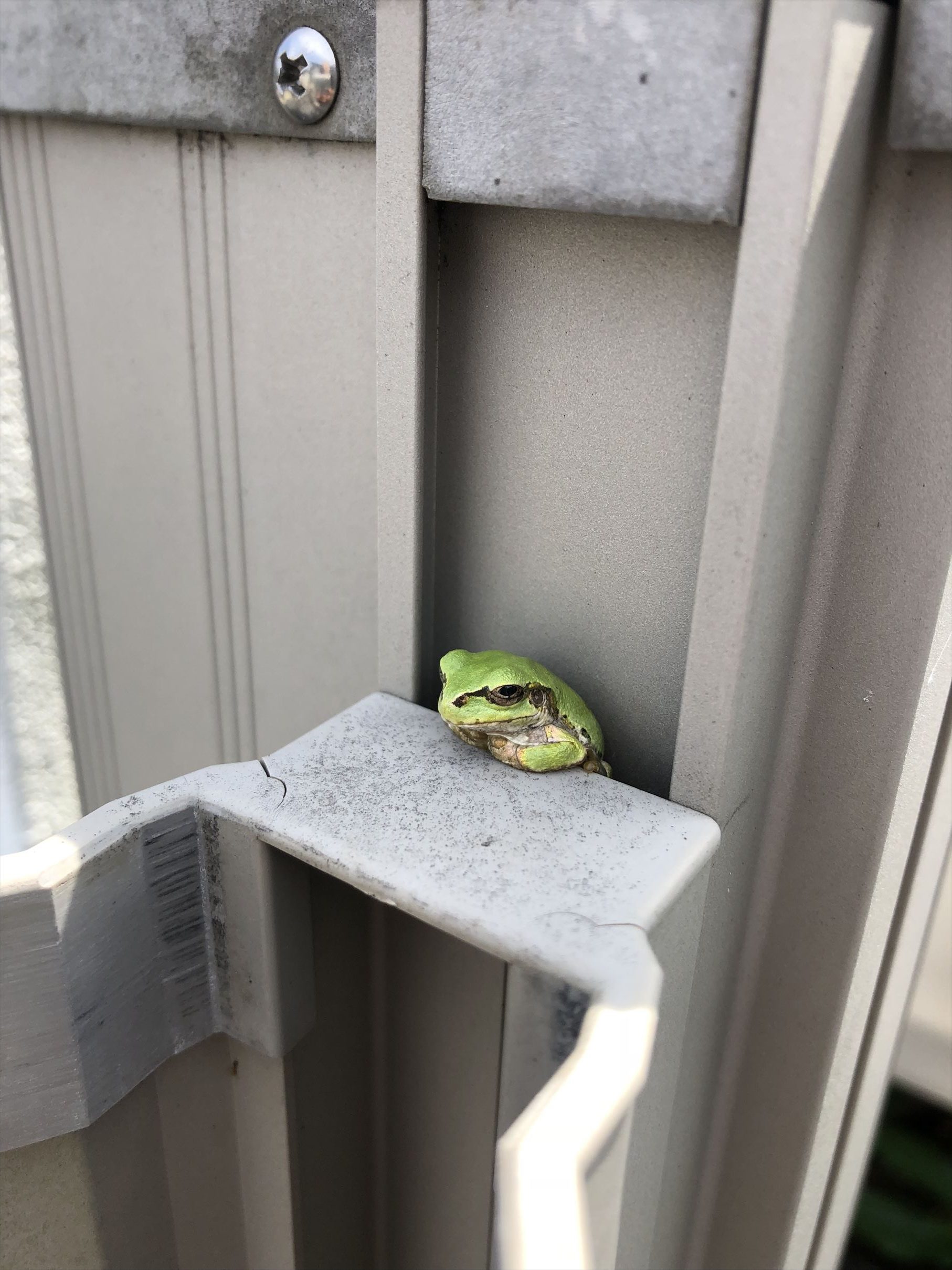 ガレージから庭に入る引き戸を引くと、緑色のものが出たり入ったり!何かと思ってよく見ると、隙間に隠れていたアマガエルです😅