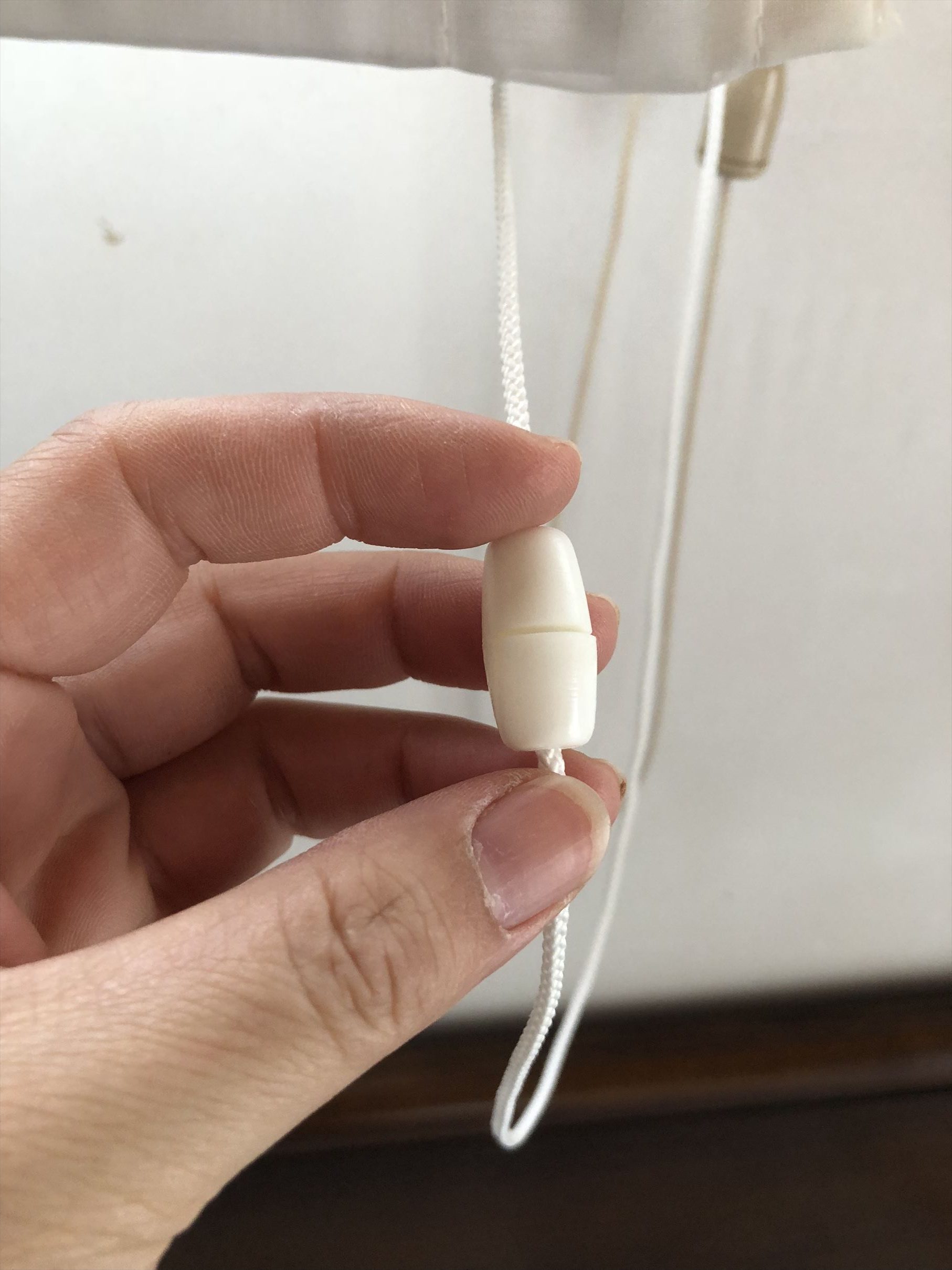 お父様はもう一つ気になることがある、というので一緒に寝室へ。小窓についたシェードのコードを指して「この部品が割れているんだけど、ホームセンターやらあちこち探したけど売ってないんだよ」とのこと。