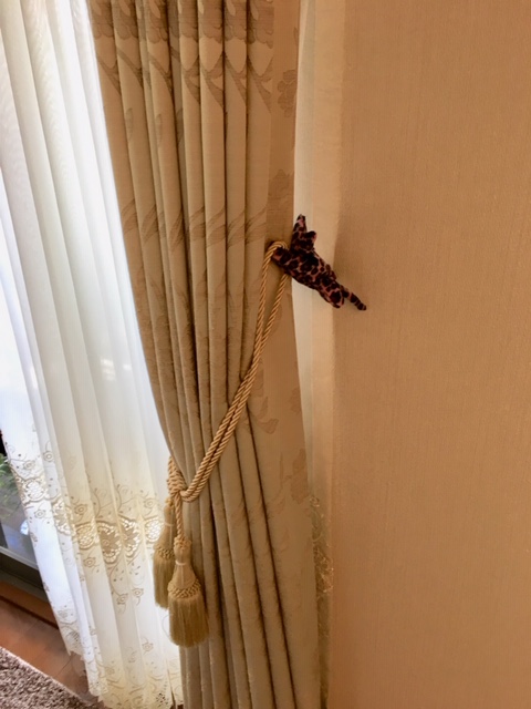 こんにちは、あにんつです。 お客様よりかわいい猫を頂きました。 中に洗濯バサミが入っていて、手で挟めるようになっています。 なので、房掛けの位置を確認するときにカーテンとタッセルを挟んでもらってます。働き者のかわいい猫ちゃんです
