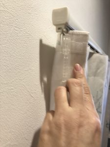 ここは私たちプロの仕事です!玄関から見て生地が表になるように、そしてシューズクロークの中からすっとかけられるよう、カーテンの芯とフックを反対向きにつけました!