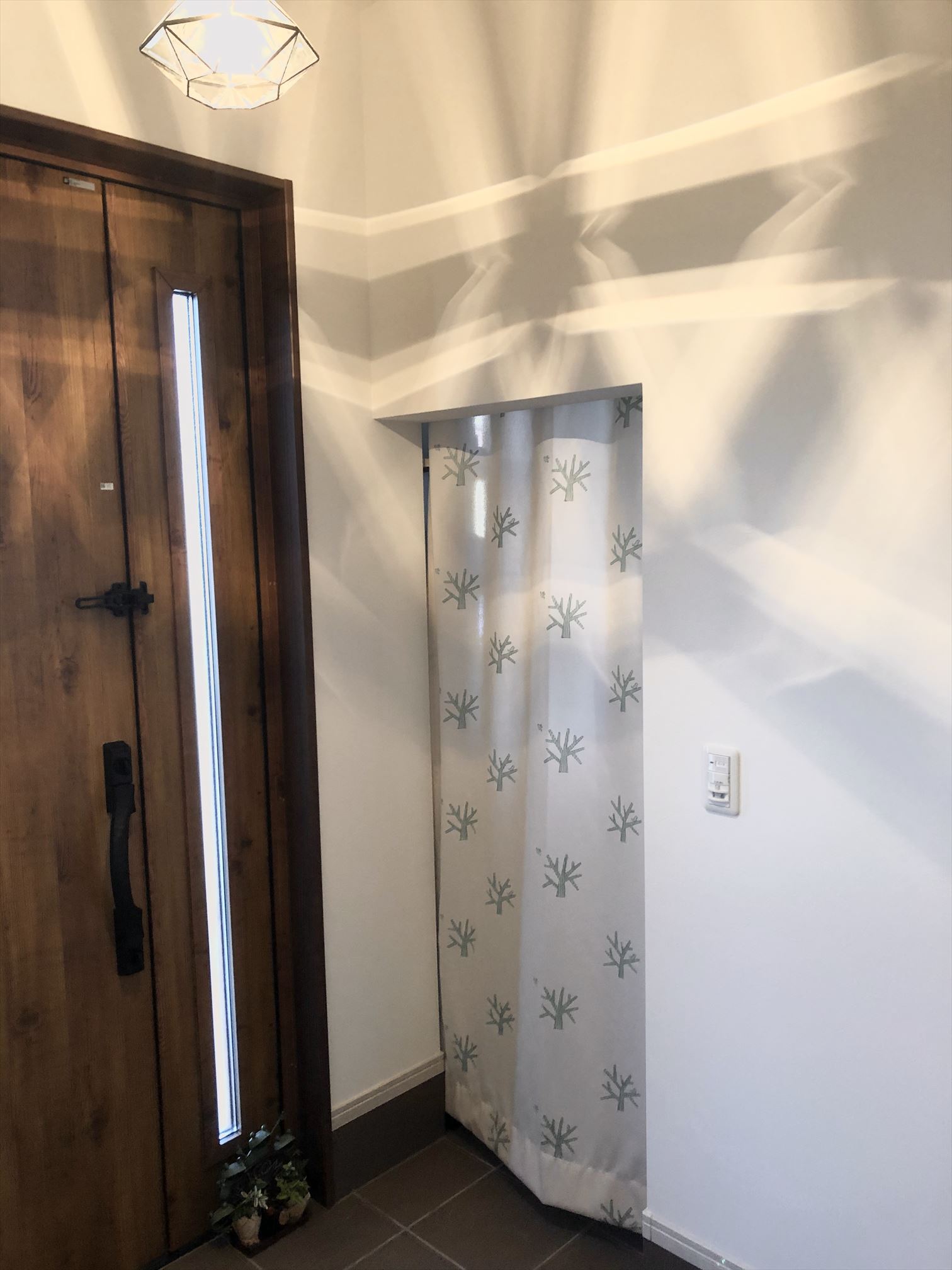 また、玄関のシューズクロークにはそれぞれ二ヶ所の開口部があり、それぞれに目隠しのものを希望されていました。一つには既にカーテンレールがつけられていましたが一つには何もありません。ロールスクリーンをつけられることも多いのですが、片方がカーテンになるのでここはお揃いで!北欧風の可愛らしい刺繍生地でフラットカーテンをお作りしました😊