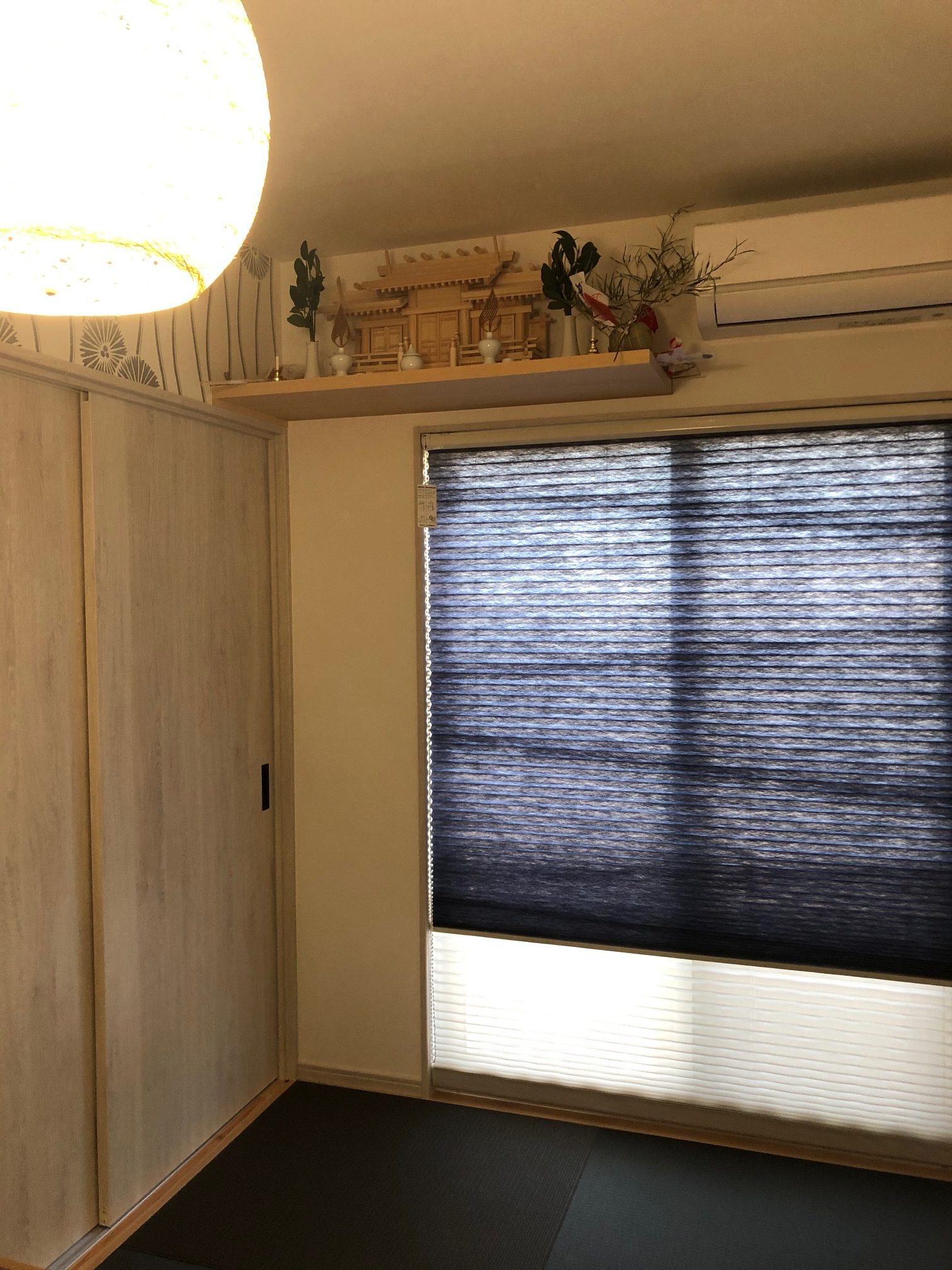 プリーツスクリーンはコードを通す穴がないハイグレード仕様、タチカワブラインドの「フィーユ」ツインタイプをお選び下さいました😄色は畳の雰囲気に合わせた紺です!