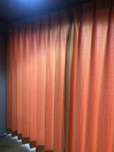 和室としてお使いになられていた窓にカーテンを、との事でした。お部屋の入口にはオレンジのプリーツスクリーンがついておりました。カーテンもそのプリーツスクリーンと同系のお色にされたいとのご要望でしたので、ドレープカーテンはオレンジ系のお色のカーテン生地をカタログでお探しし、サンプルを取り寄せてご自宅で確認をして頂きお選び頂きました✨