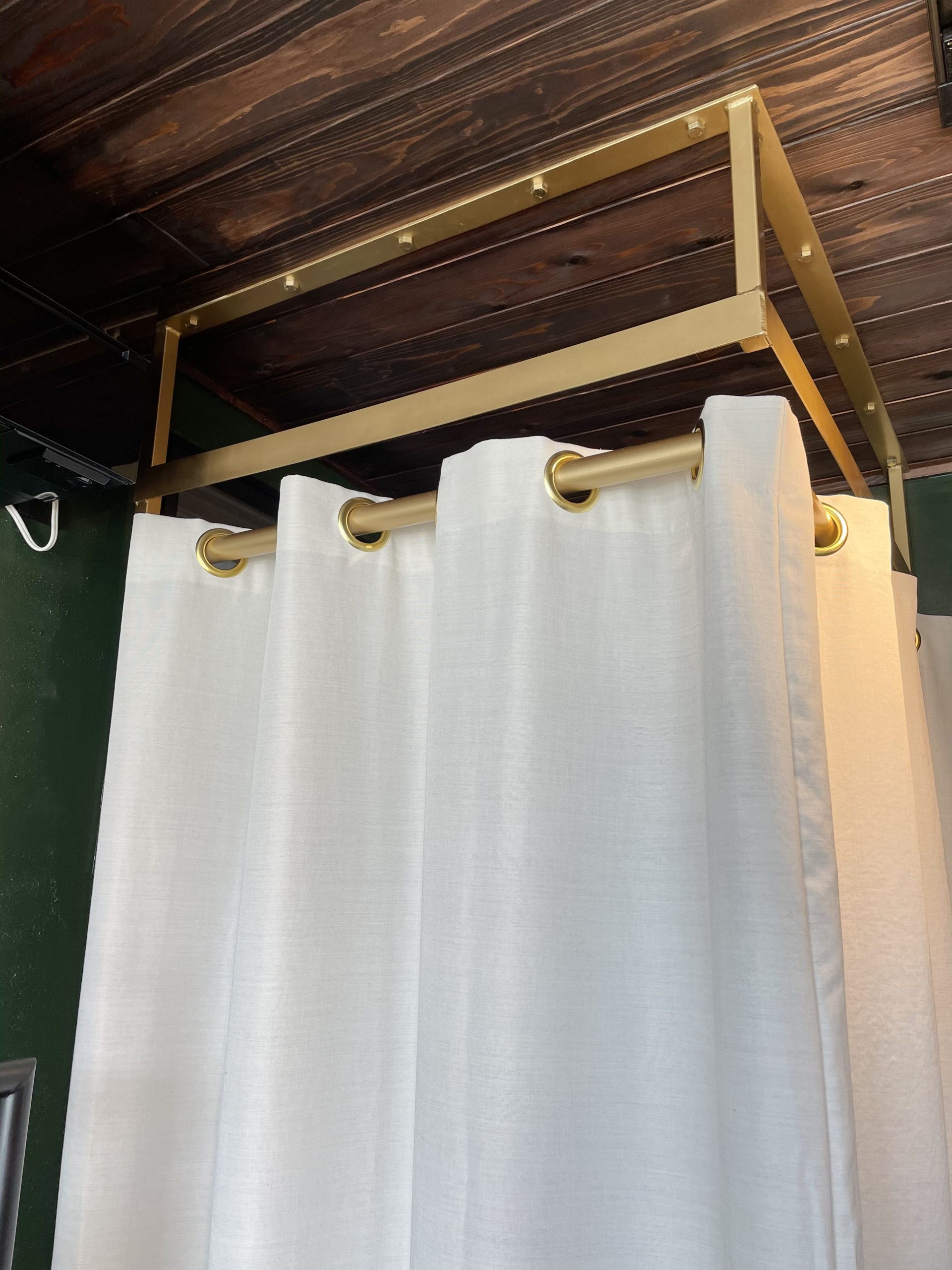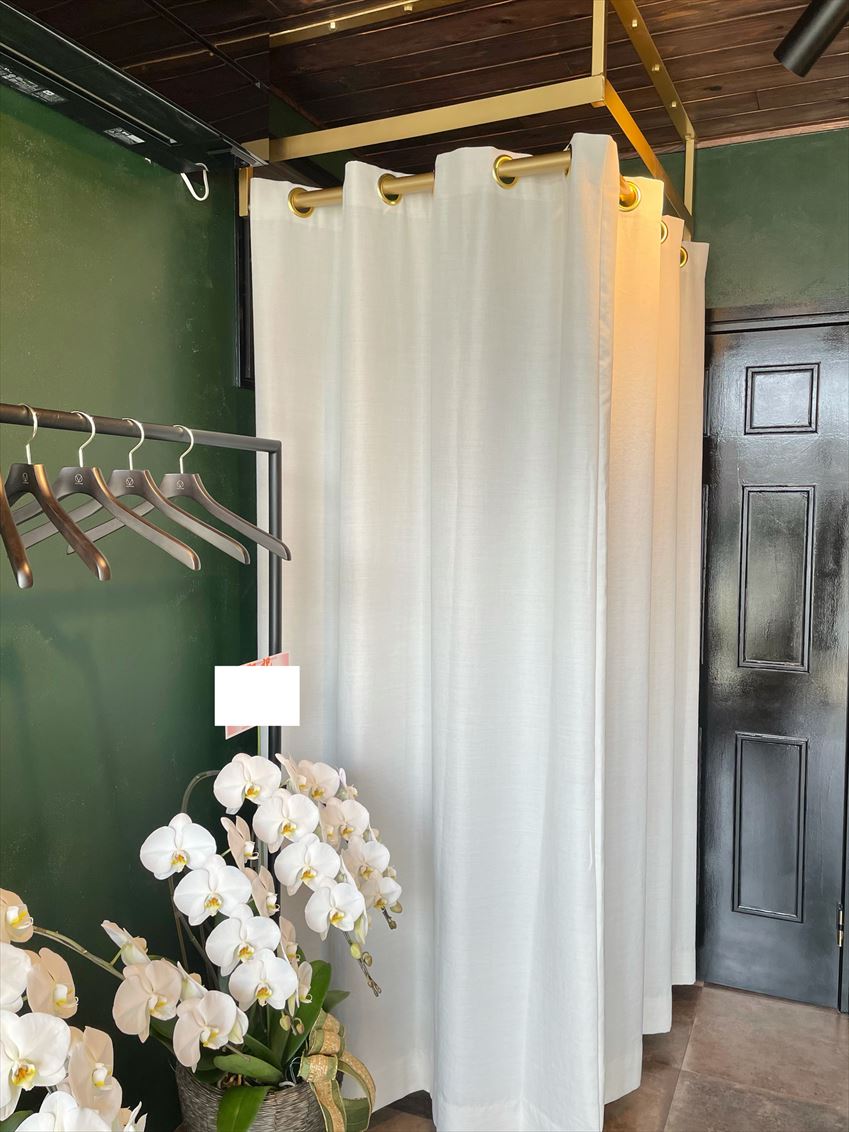 ご来店当初からハトメスタイルのカーテンをお探しでした。ショップのフィッティングルームにはすでにゴールドのポールが設置されており、お聞きしたポールの径とハトメの内径とのバランスなどを充分に検討し、こちらでベストのサイズを算出しお作りしました。
