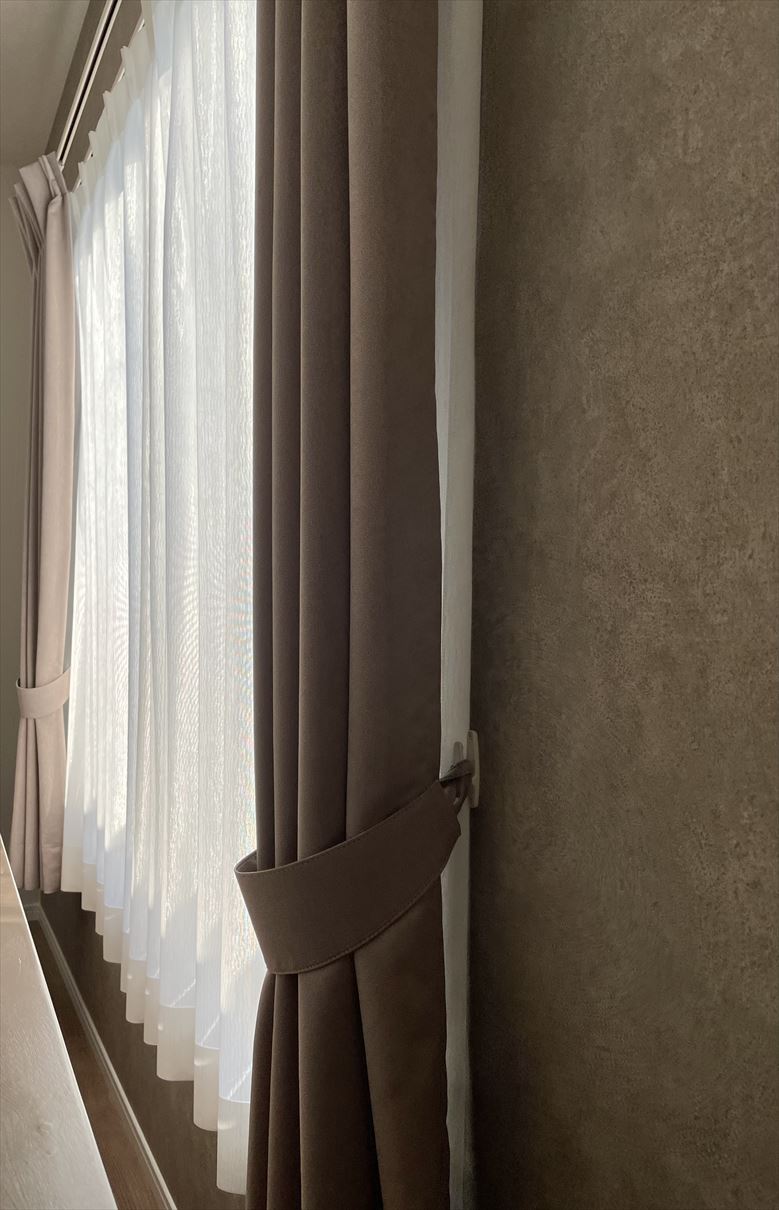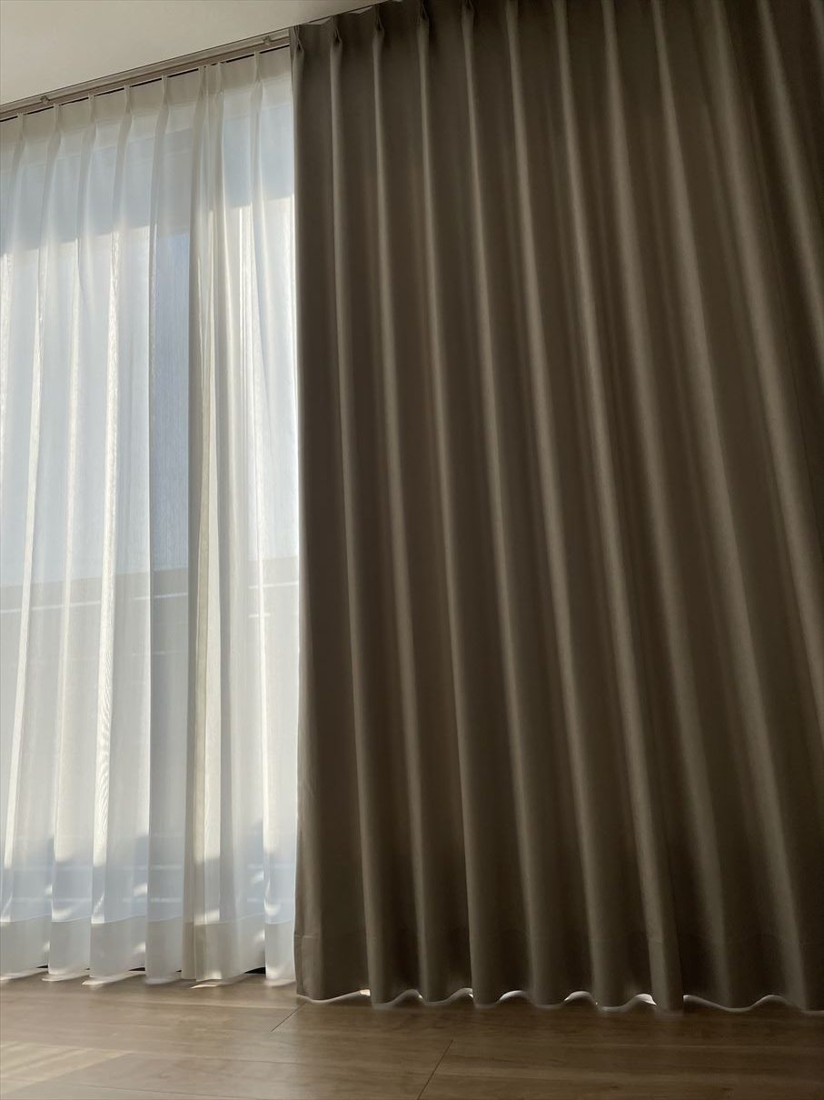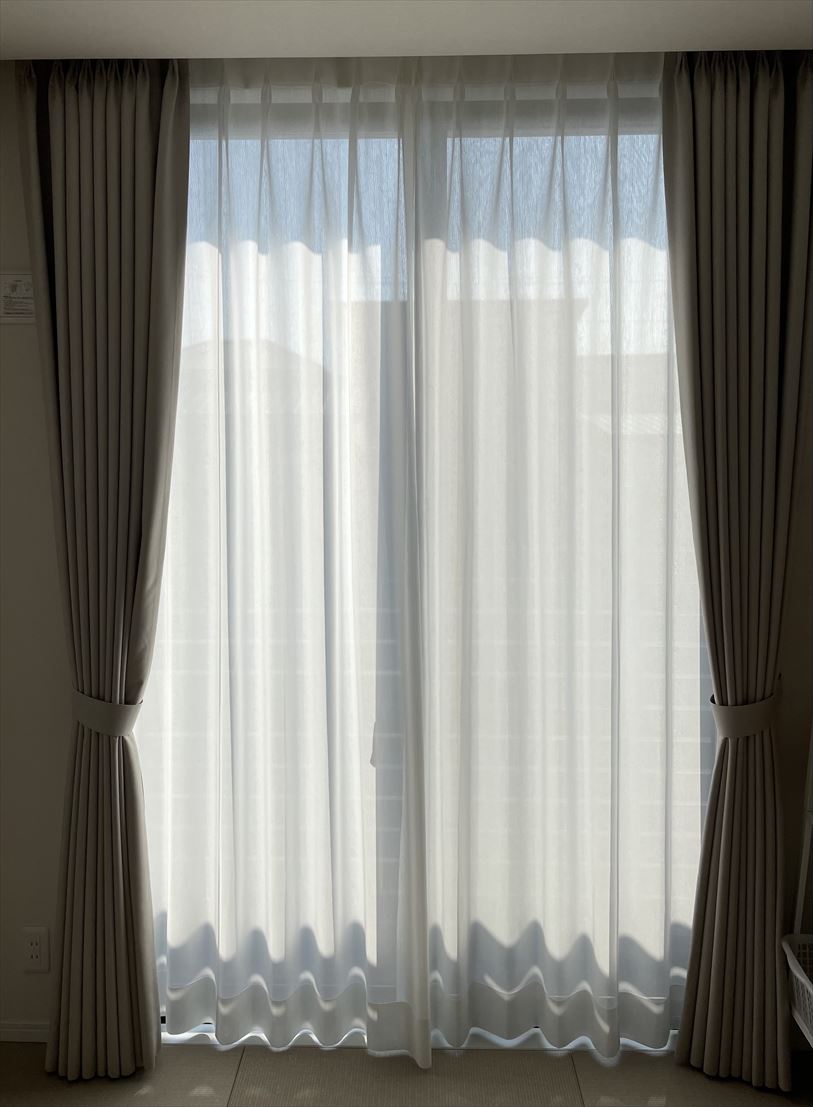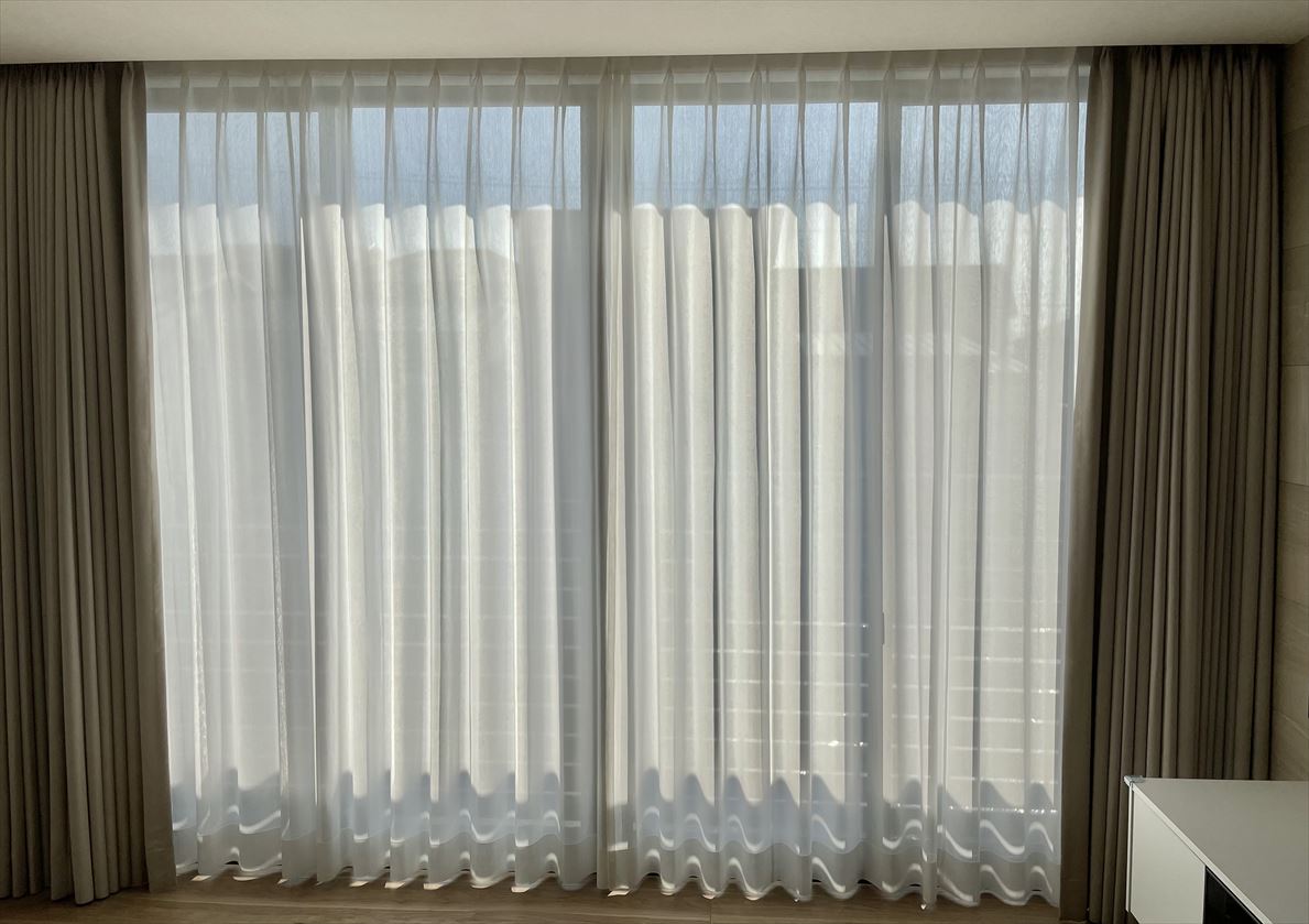 生地に厚みがないので大きな窓ですがスッキリと収まりました。カーテンにウェーブのでる加工を施すことで閉めている時もとても綺麗だと思います。