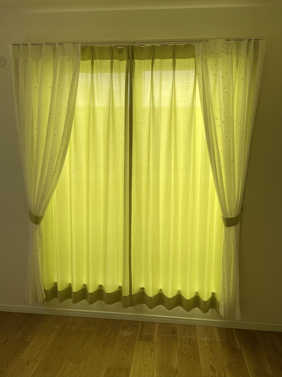 シンプルな無地のドレープカーテンをお選び頂きましたので、グリーンのカーテンの方は少し遊びが出るようにお部屋側にレースカーテンをお付けさせて頂きました。