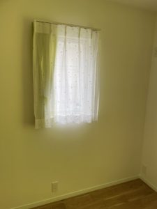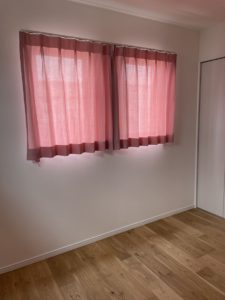 ピンクのカーテンのお部屋はまだお子様が小さいのですぐには使わないとの事でしたので、レースカーテン無しでドレープカーテンのみをお付けしております。