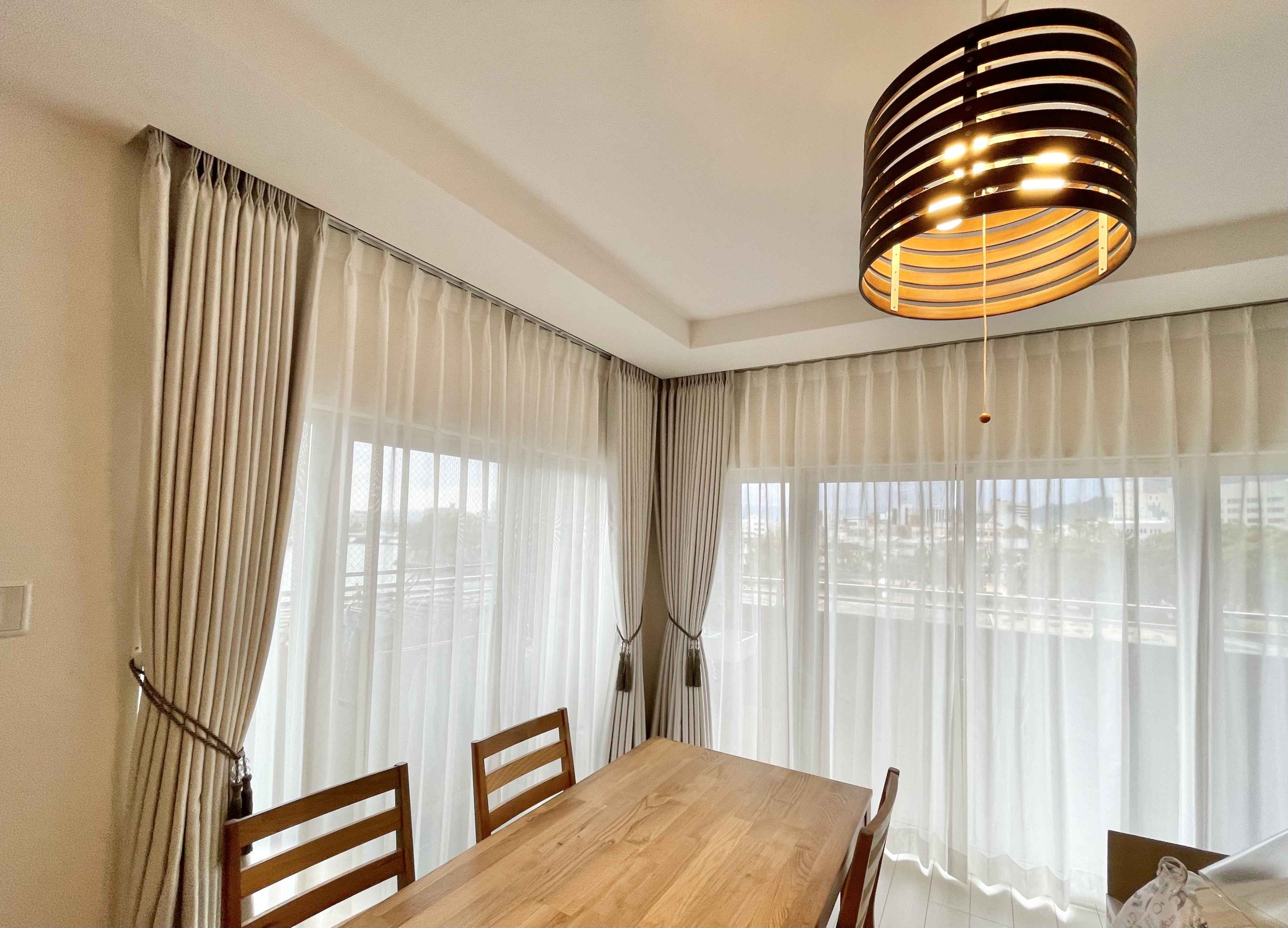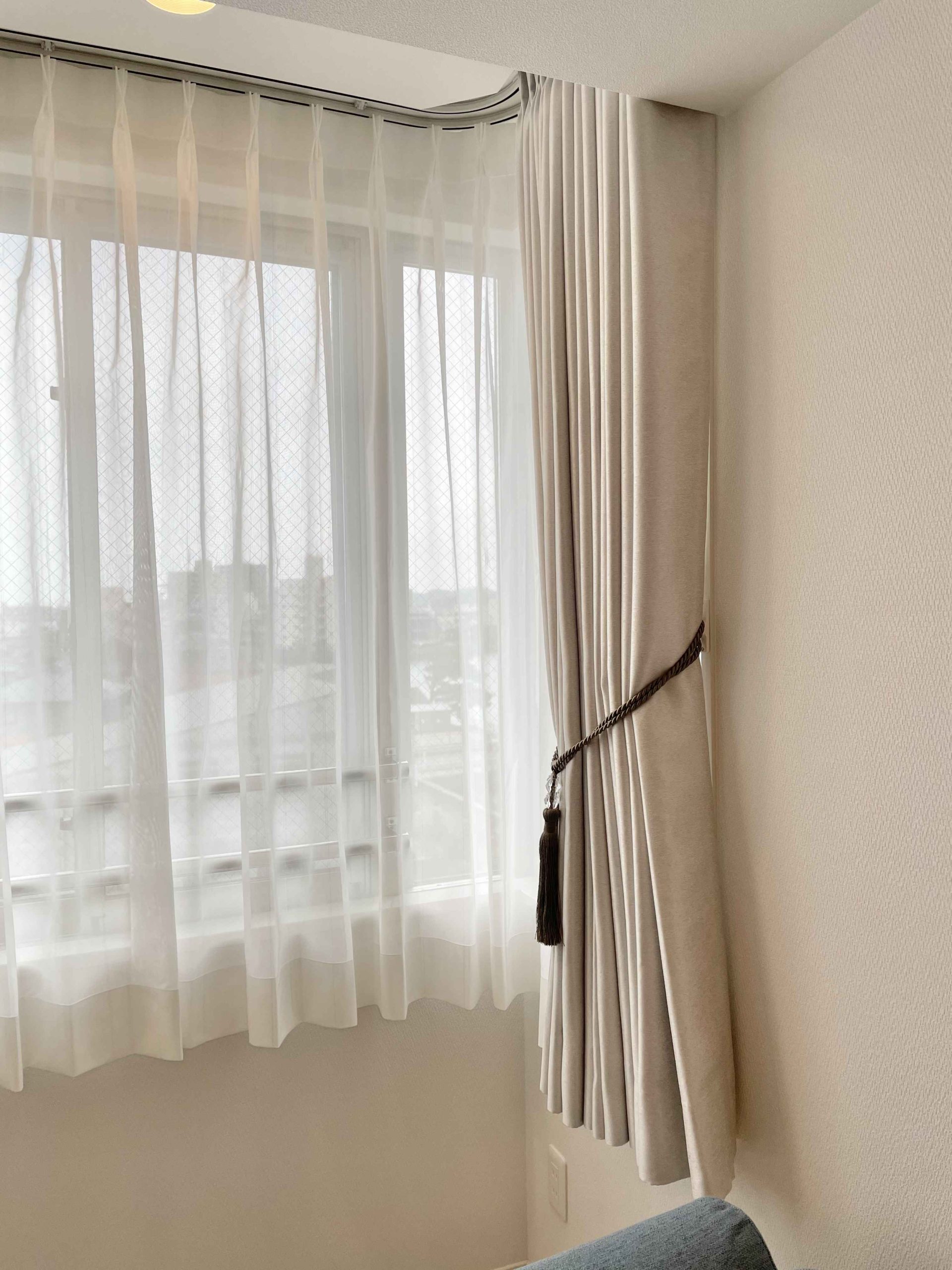 ドレープカーテンは当初より奥様がホワイト系の遮光生地をご希望だったのですが、ホワイト系は濃色よりも光を透しやすくなるため、何枚かのサンプルの裏からライトを当てて実験した動画をLINEにてお送りしました。お客様にはとても分かりやすかったと喜ばれました。