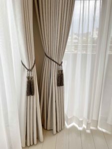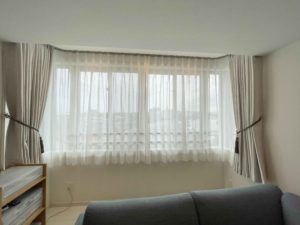 こちらのマンションは大きい窓面がやや西に振っているため、お昼前から夕方にかけて大変よく日が当たります。ご入居は冬でしたが夏のことも考え遮熱効果のあるミラーレースをお勧めしました。しかし遮熱効果の高いものを選ぶとそれに比例して見通しも悪くなるため、ほどよい見通しも得られる生地をお選びいただきました。もとは横ストライプの生地ですが、お客様のお好みである縦ストライプとしてお仕立てし、大変気に入っていただきました。