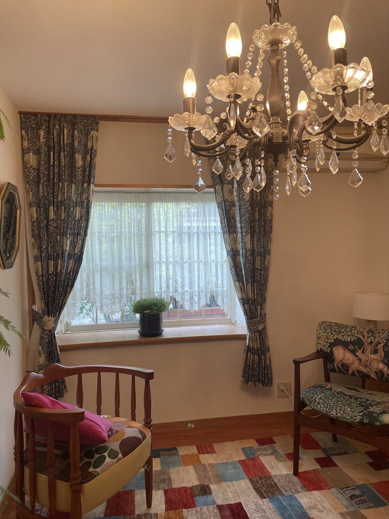 2年前に写真右側の椅子生地で別のお部屋のカーテンと椅子の張り替えをさせて頂きました。