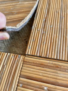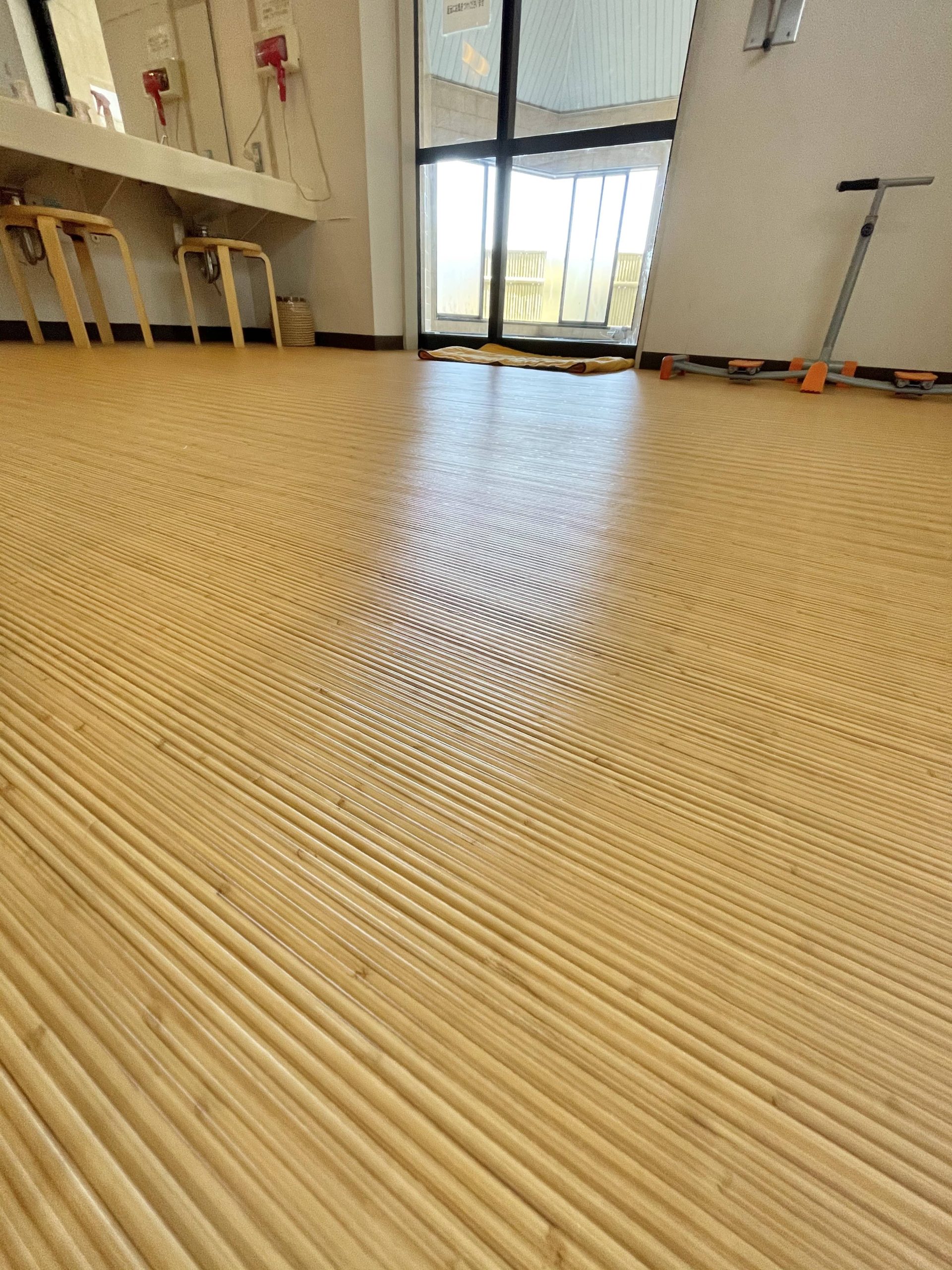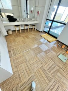 先の網代タイルは見た目はよいですがお手入れやお掃除がややしづらいことと、貼り替えの際は困難な作業になるので、今回はクッションフロアを施工しました。拭き掃除なども容易で将来の貼り替え作業も安心です。また店舗用の厚手タイプを選んでいるので家庭用よりも耐久性があります。