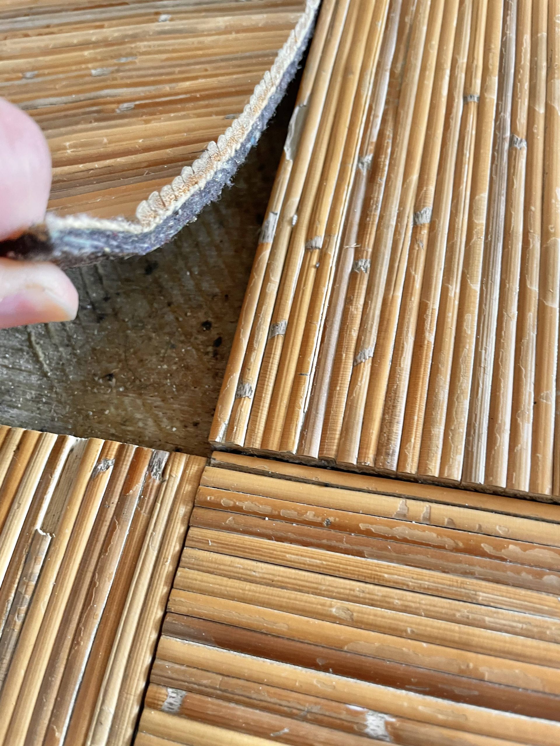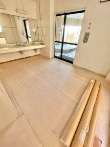 ホテル様のご都合で急遽貼り替えになりました。先に施工していた網代タイルは一部浮いていたところもありましたが、大半は下のベニヤに頑丈に貼り付いており大変困難な剥離作業となりました(このような施工方法のところはこうなることがよくあります)