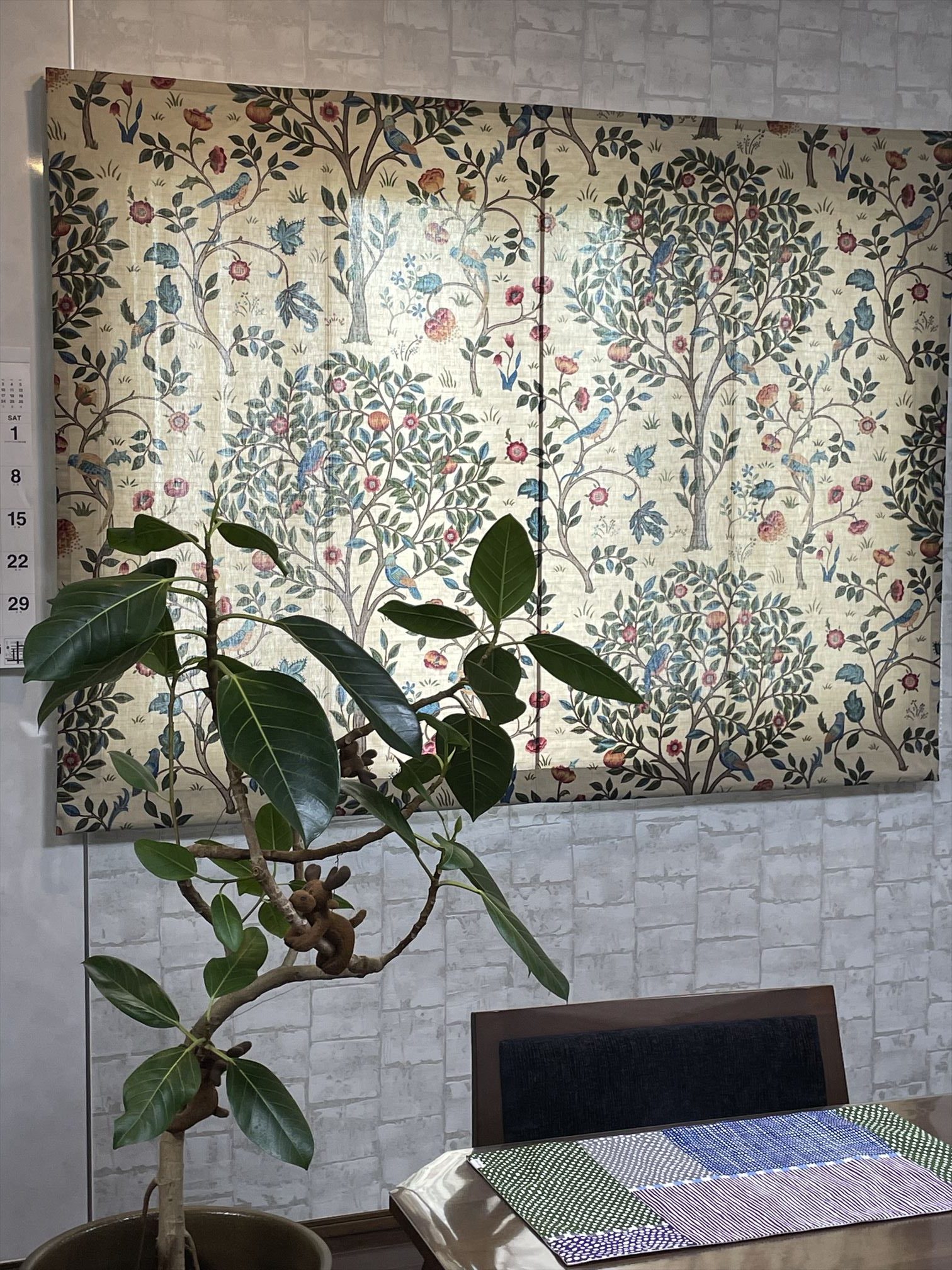 初めはご寝室のカーテンの掛替えをお考えだったのですが、リビングの窓にモリスの生地をあててみた所、